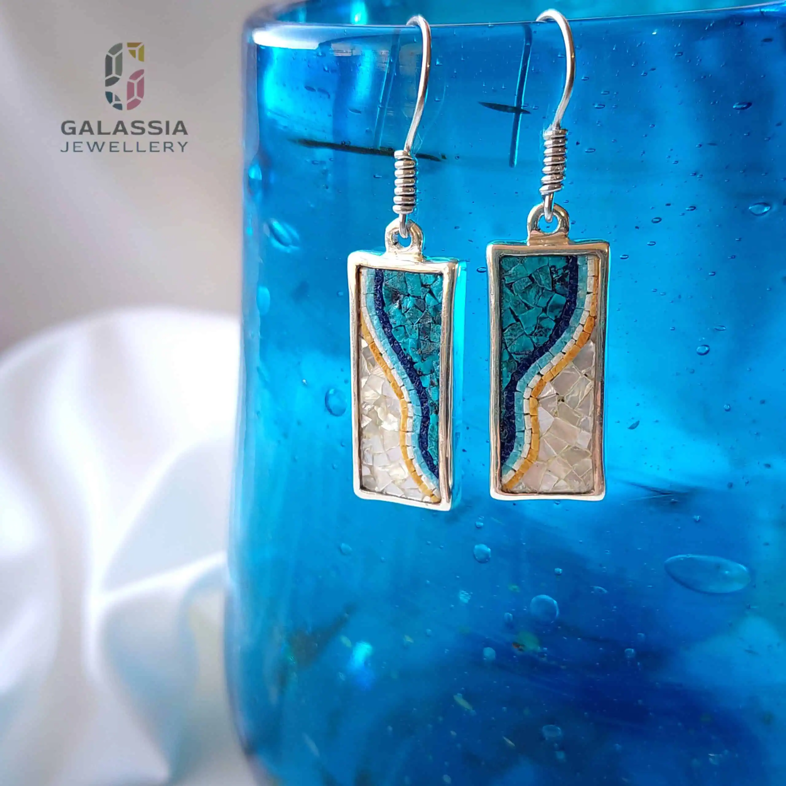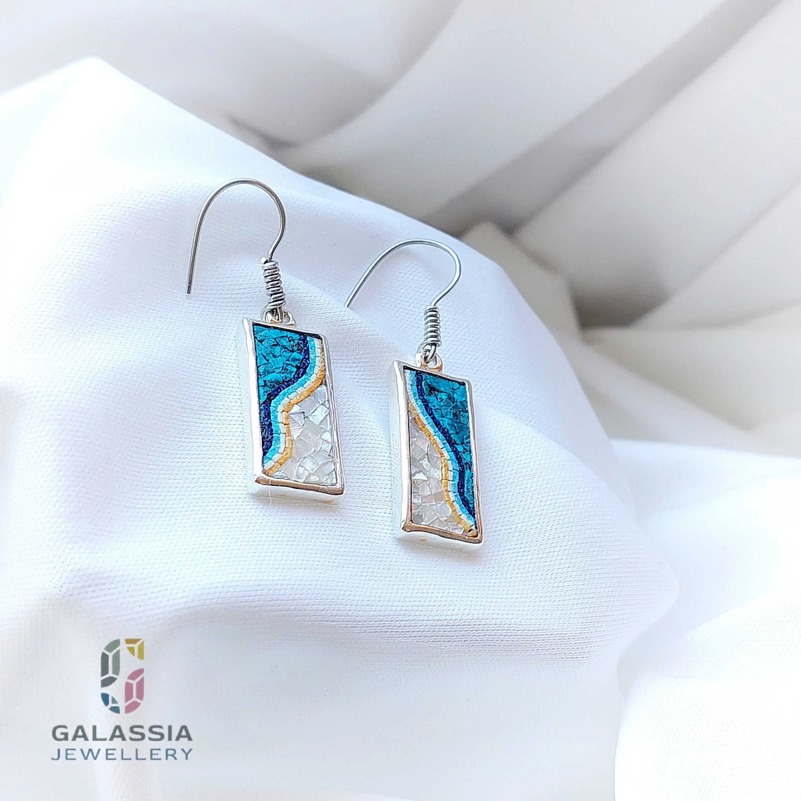 These earrings take you on a journey to the depths of the sea and the charm of nature through a micro mosaic unique design that embodies creativity and sophistication. Crafted from high-quality natural materials such as pure white seashells and the Eilat stone, sourced from the renowned Eilat region, known for its natural beauty. These elements are seamlessly paired with 925 sterling silver,
