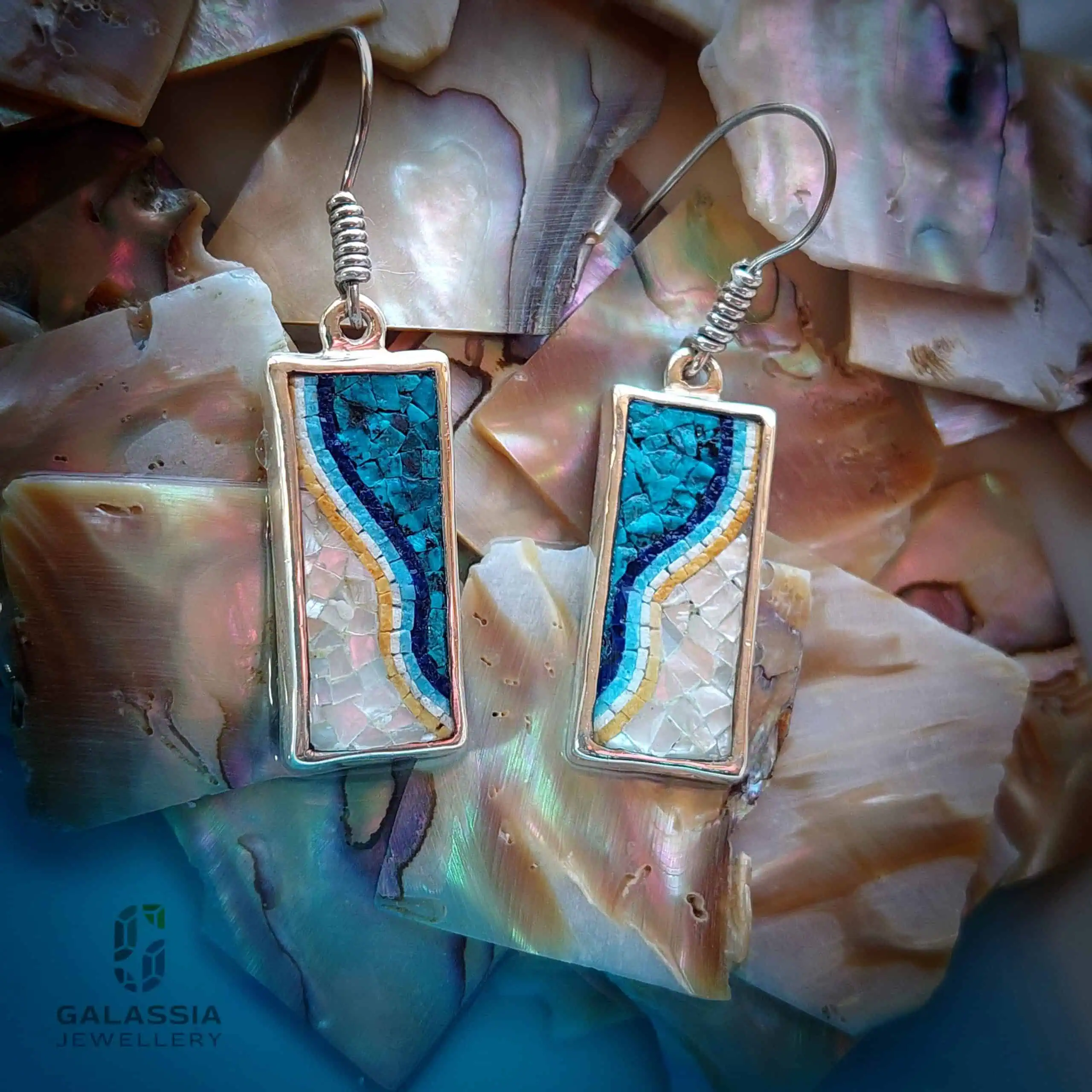 These earrings take you on a journey into the depths of the sea and the magic of nature through a unique micro-mosaic design that embodies creativity and sophistication. Made from high-quality natural materials such as pure white seashells and Eilat stone, from the famous Eilat region, known for its natural beauty. These elements are seamlessly combined with 925 sterling silver,