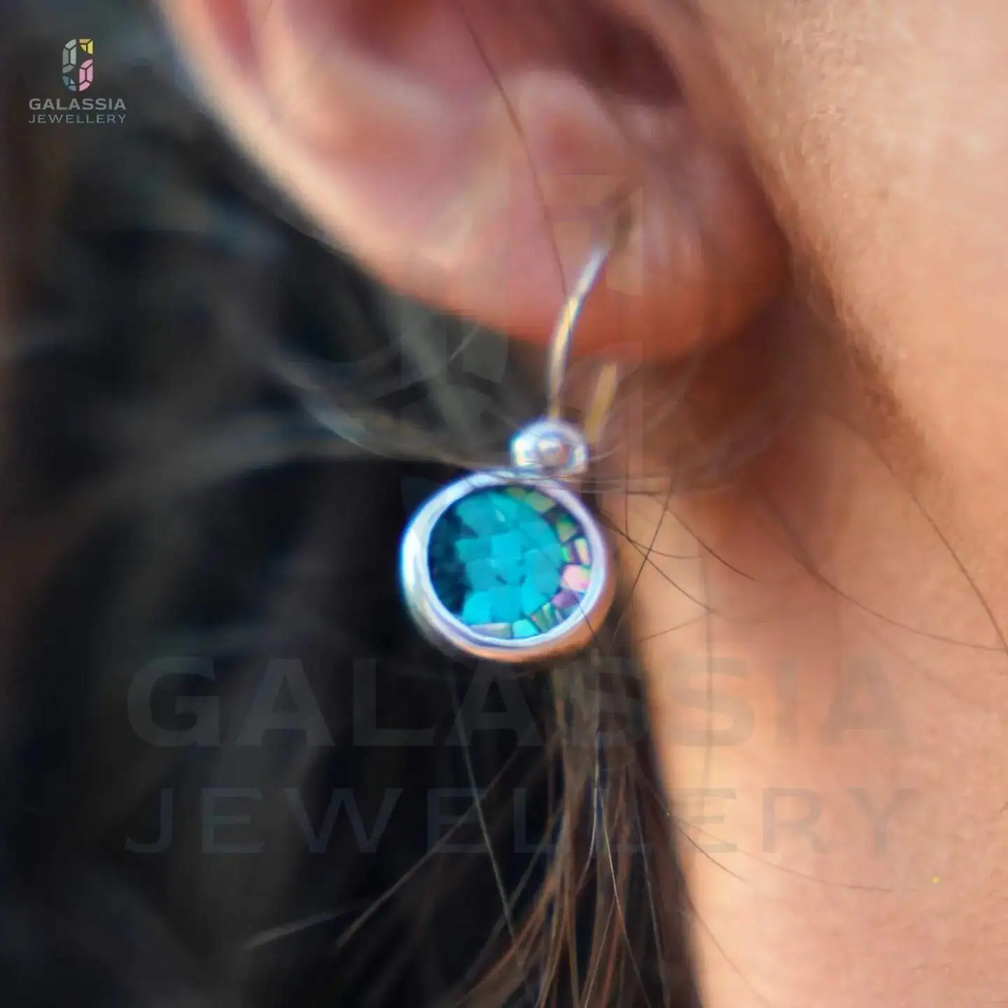 Cami Blue Round Mosaic Earrings made with intricate micro mosaic design. Perfect for adding a touch of timeless beauty to any outfit. Discover this unique handmade jewelry piece at Galassia Jewellery.