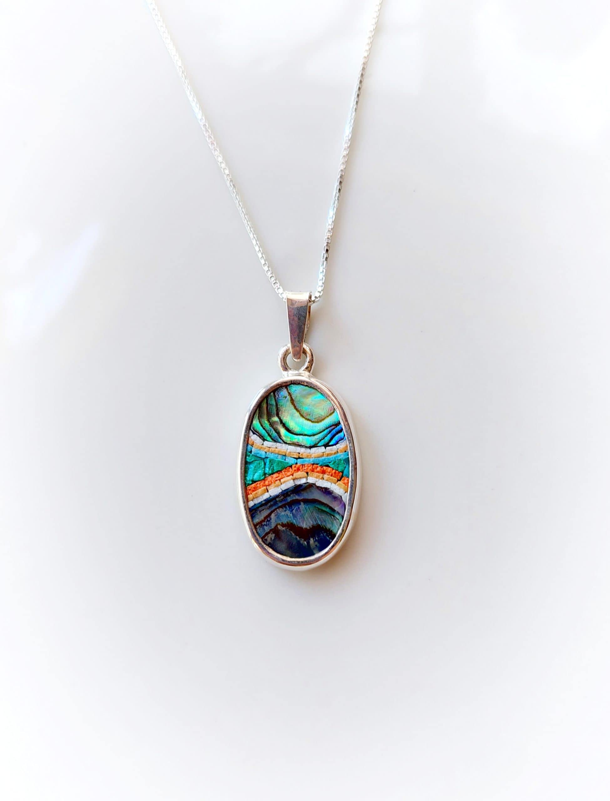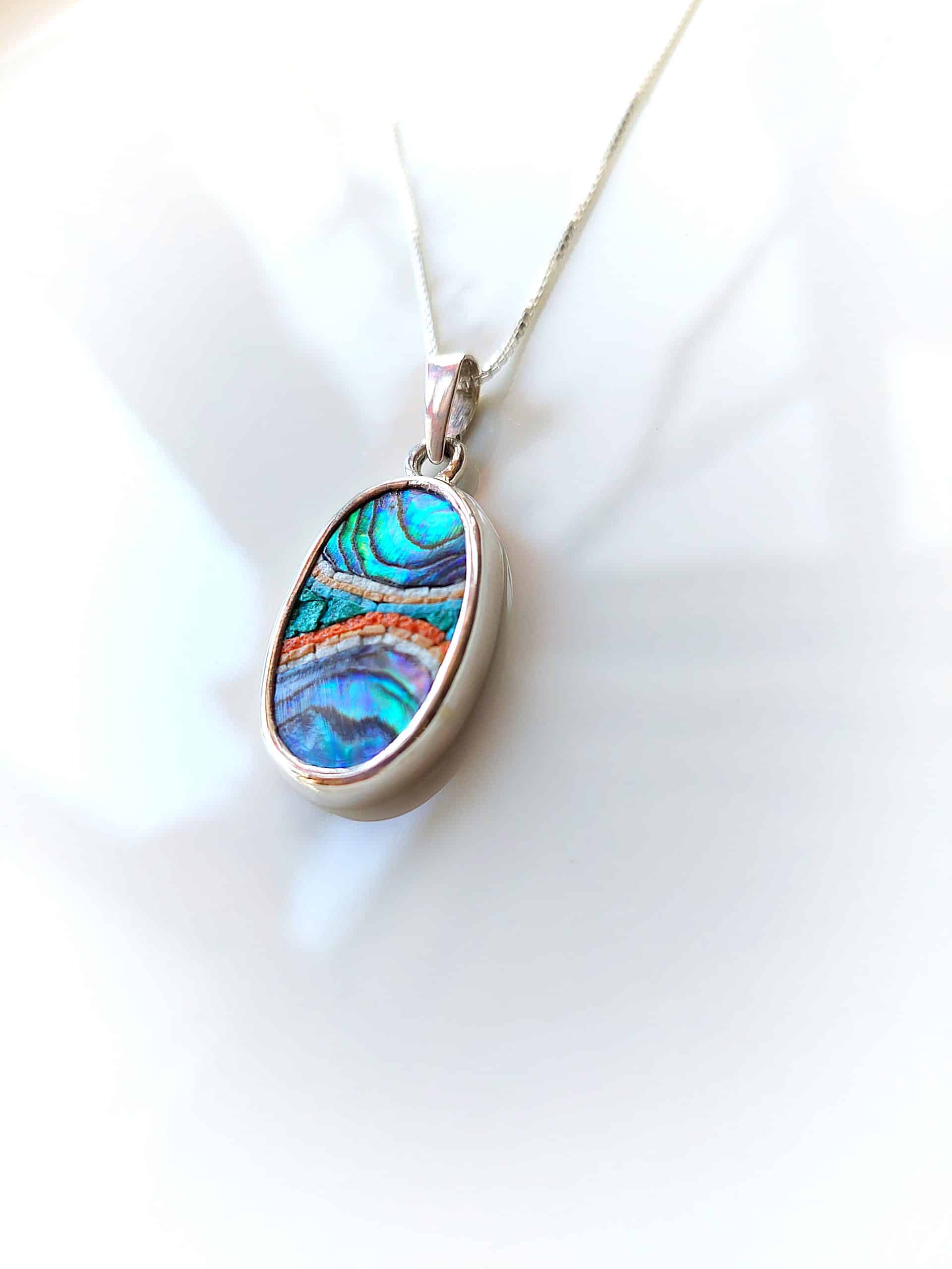 Our micro-mosaic pieces are crafted by stacking stones tightly without gaps, using a specialized adhesive, and securing them in a silver frame for extra durability.