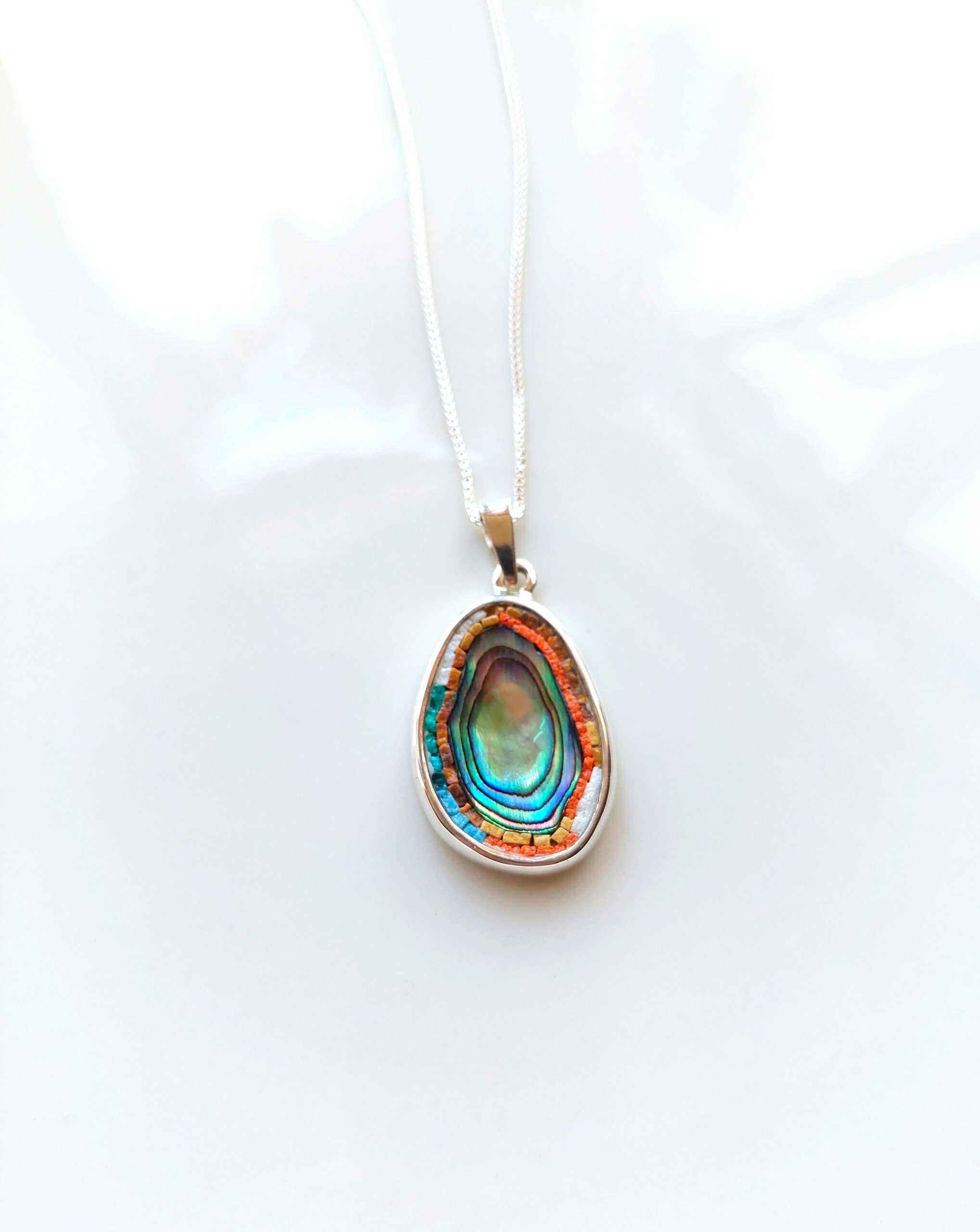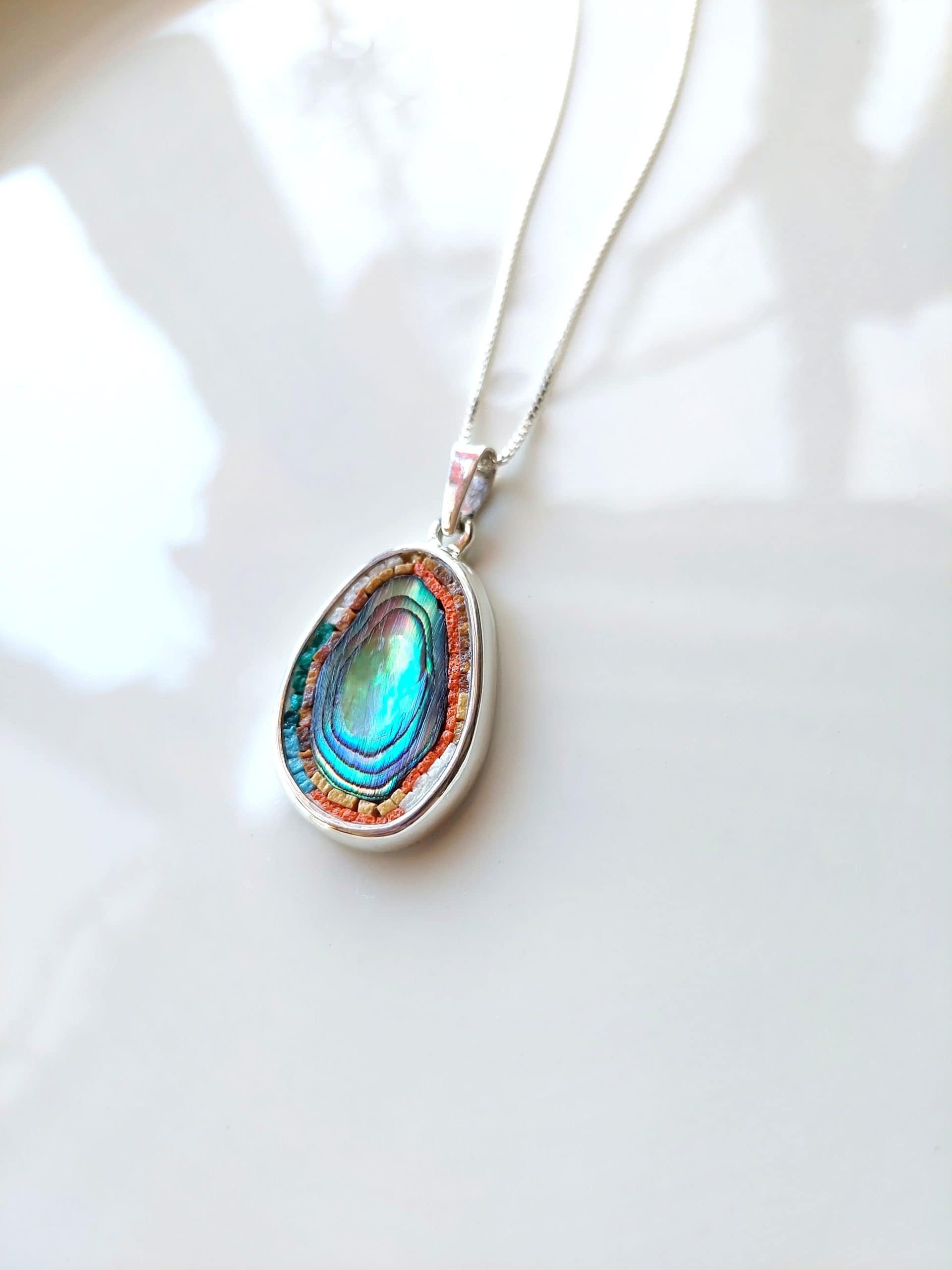 Our micro-mosaic pieces are crafted by stacking stones tightly without gaps, using a specialized adhesive, and securing them in a silver frame for extra durability.