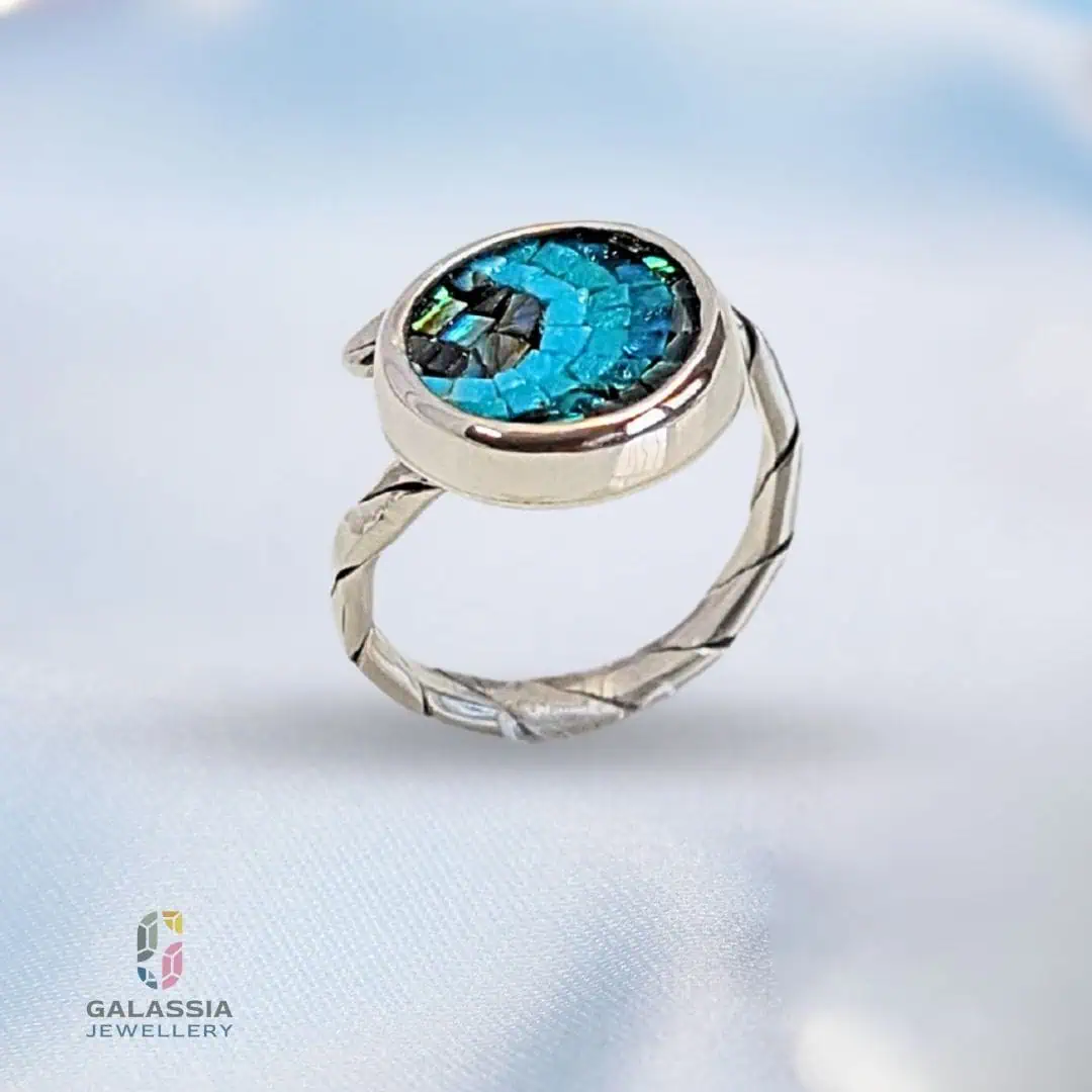 The “Cami” Ring is an exceptional handmade micro mosaic Ring inspired by the tranquility and vibrant colors of the sea. Carefully crafted using the traditional micro-mosaic technique, it features natural seashells and charming turquoise, reflecting the beauty of ocean waves.