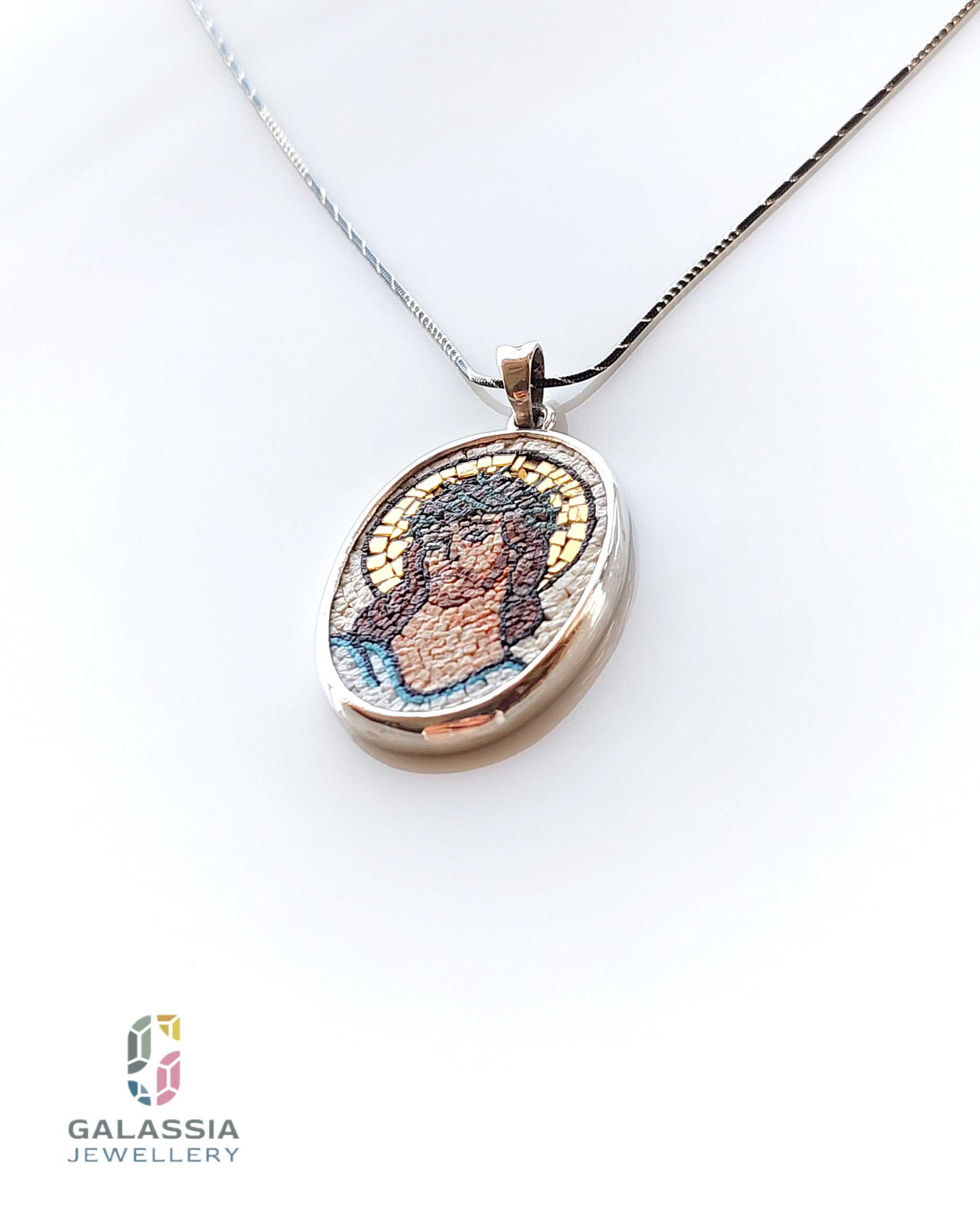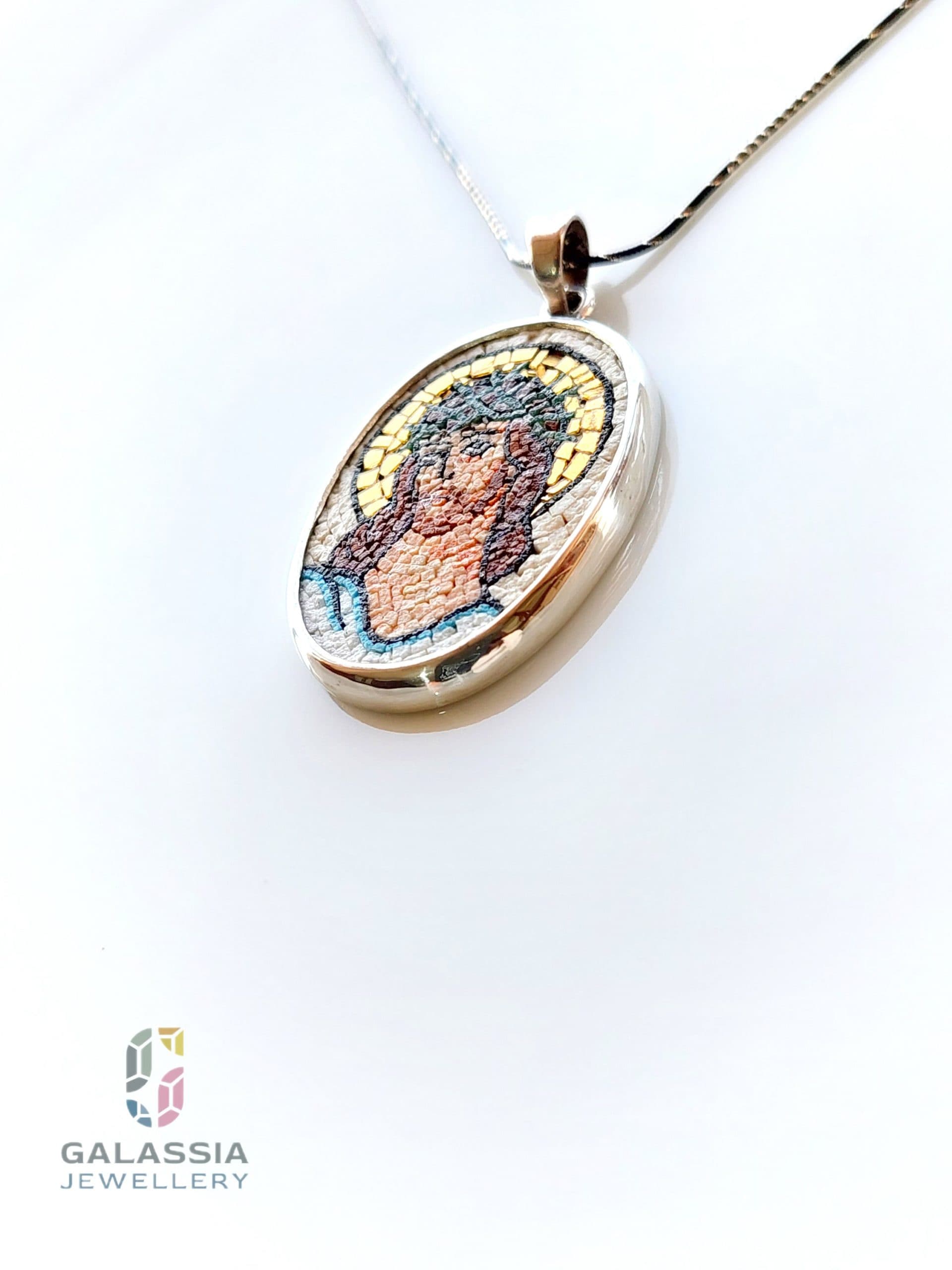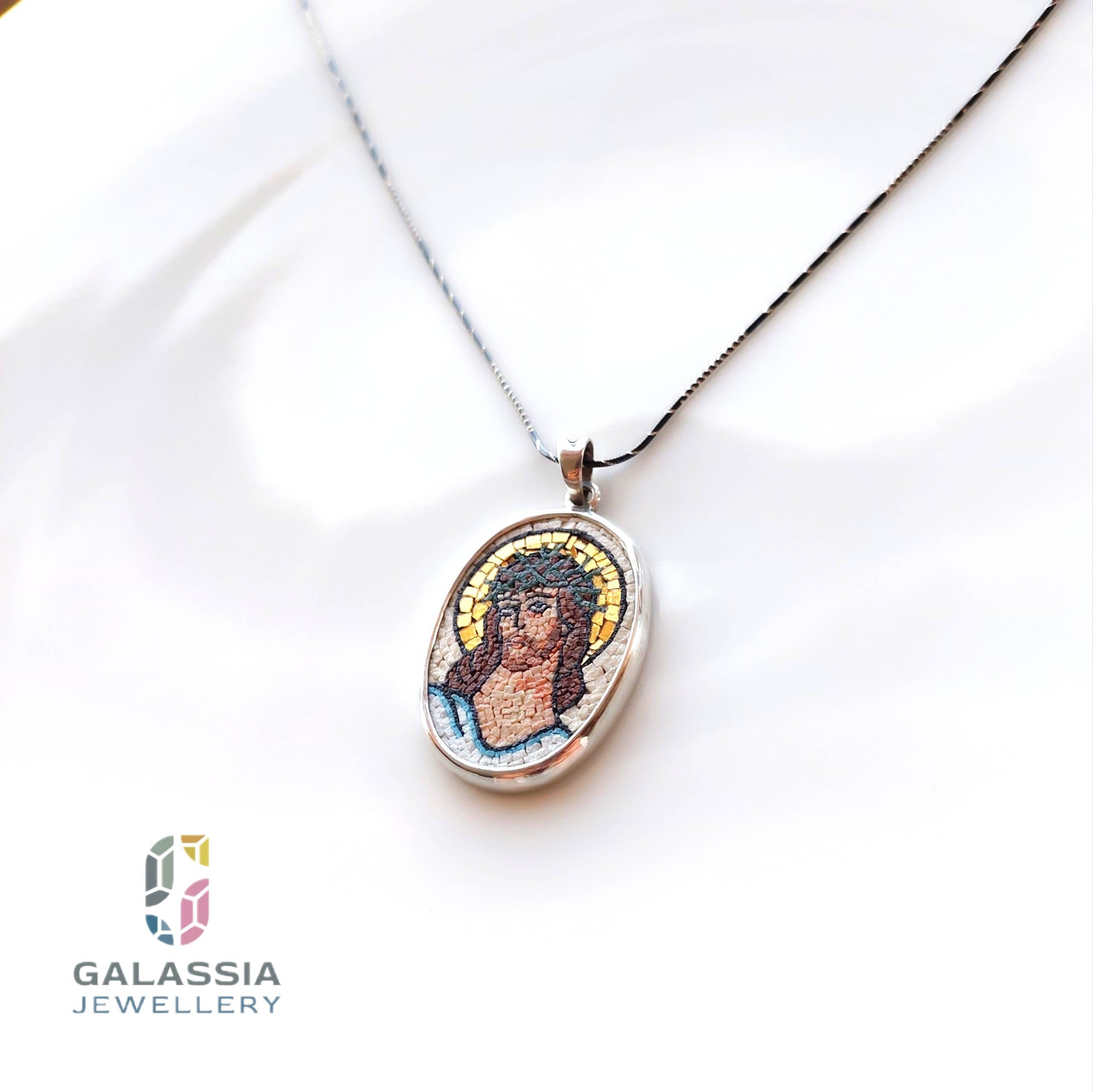From the heart of Bethlehem, the city of peace and holiness, we at Galassia Jewellery have crafted the Christ Necklace with micro-mosaic detailing. A piece that carries the essence of history and the spirit of faith, telling a story of masterful craftsmanship and touching hearts with love and hope.