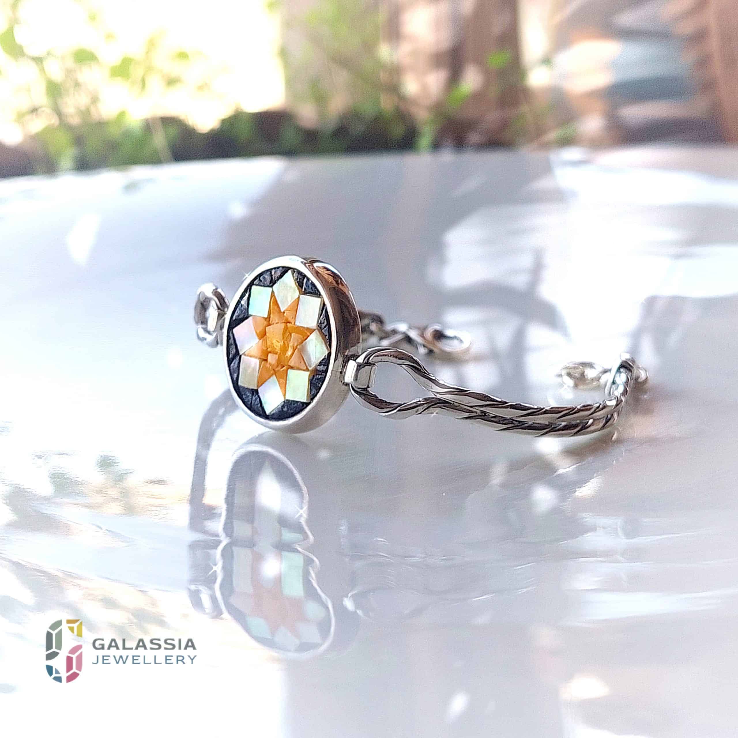 The bracelet shines with natural micro-mosaic pieces of seashells and stones, along with a touch of Italian glass in the middle of the design, making it a harmonious painting that reflects a perfect balance between the elements. Pure 925 silver was used to form the bracelet structure with an elegant design that enhances the beauty and quality of the piece.