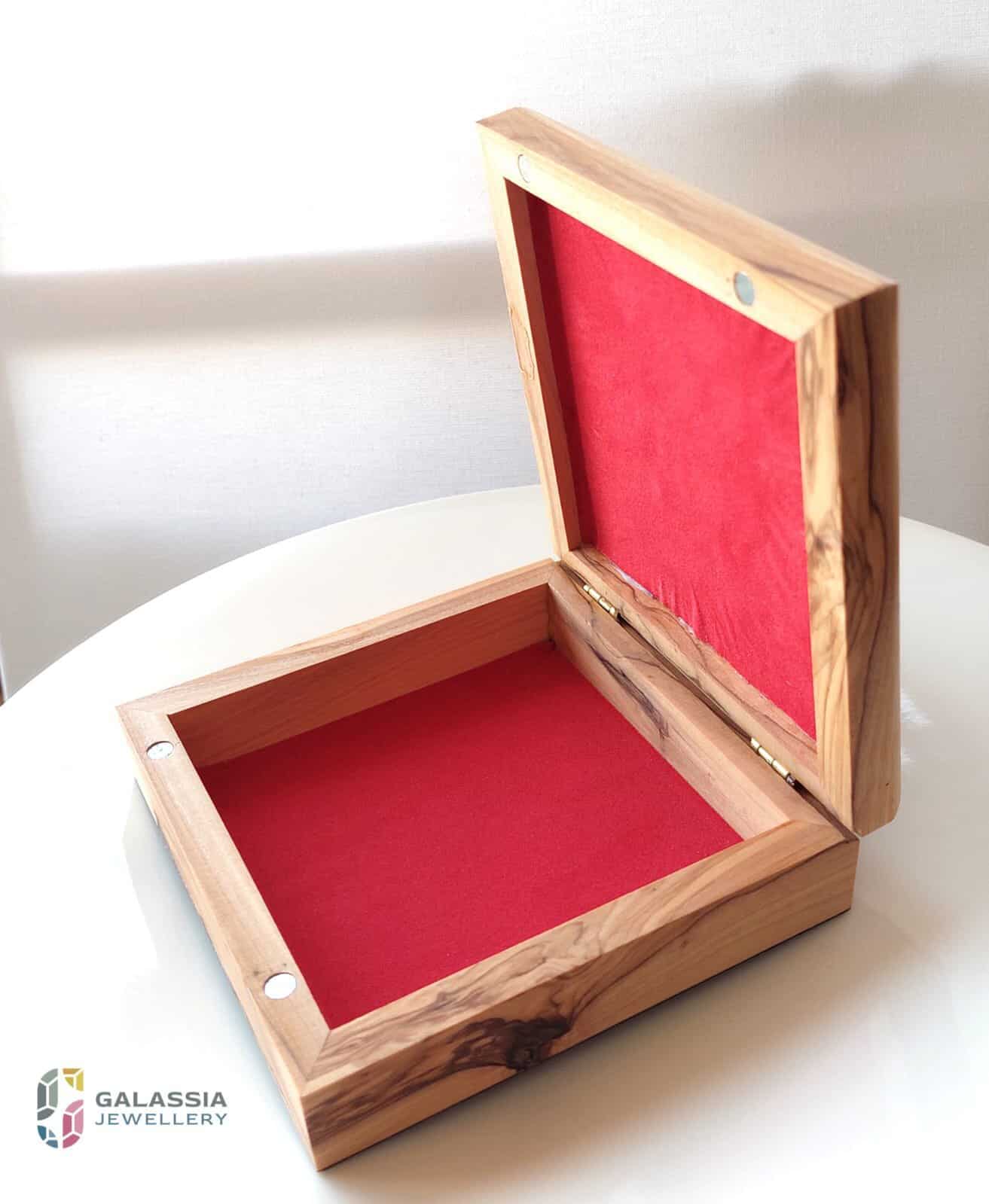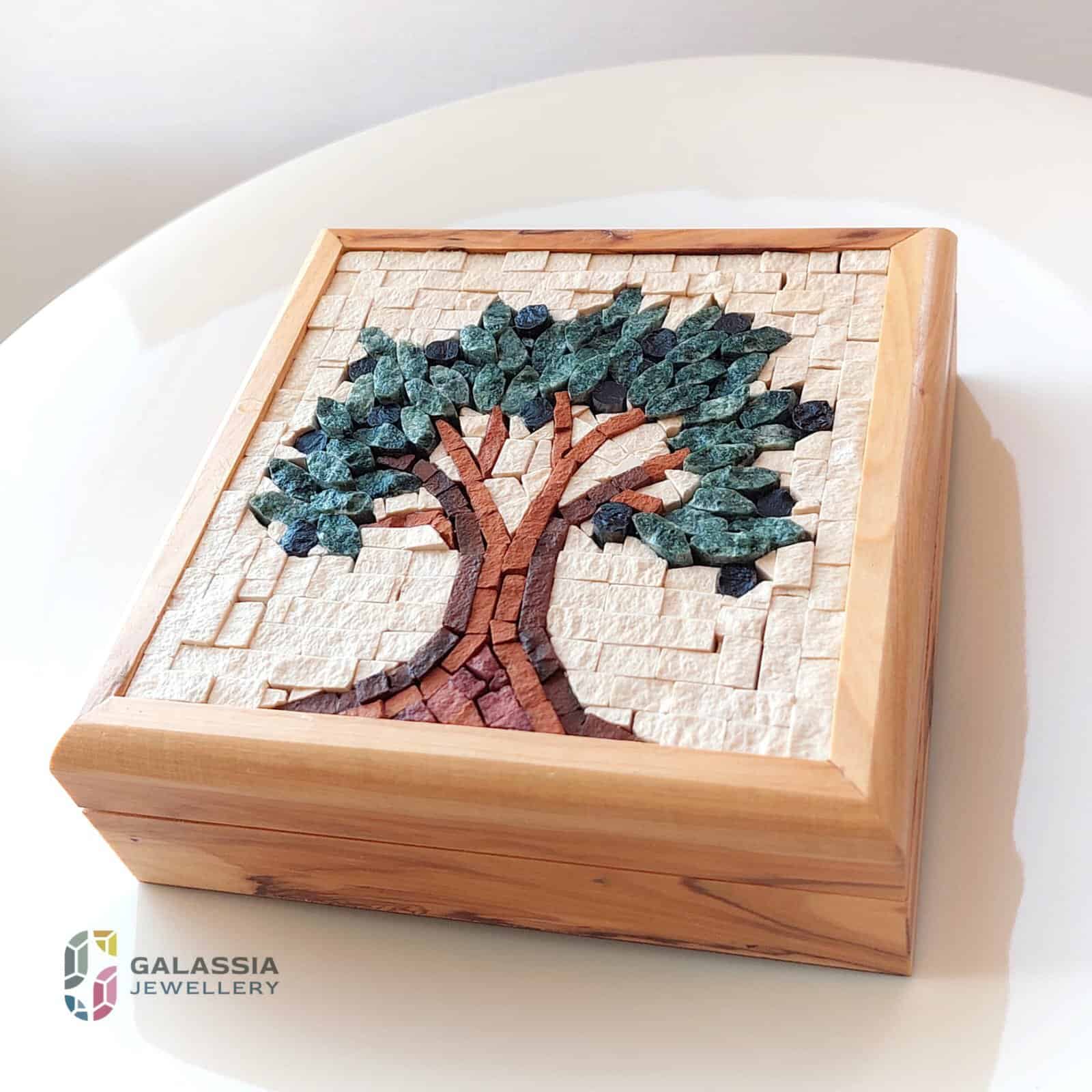 Store your precious jewelry in this unique, fully handcrafted box made from natural olive wood. Each piece is carefully made with precision and beauty, featuring an artistic mosaic of carefully selected stones depicting an olive tree, a symbol of authenticity and peace.