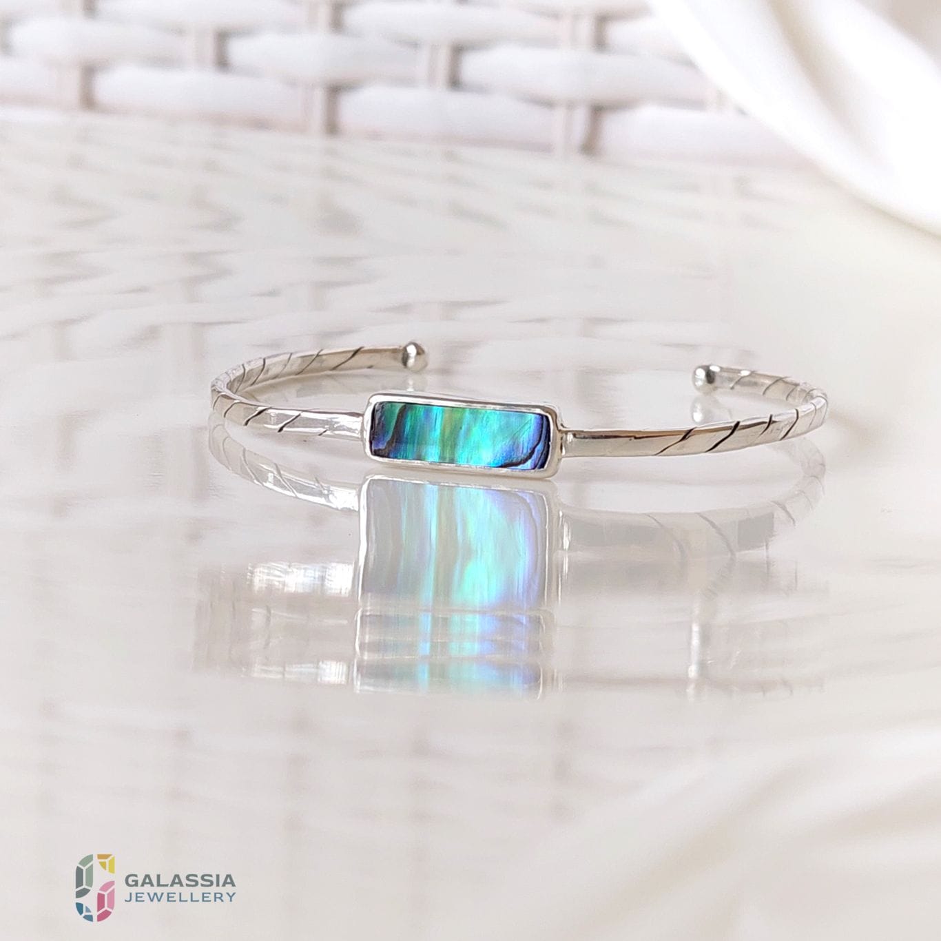 This handmade silver bracelet is crafted from 925 sterling silver and features a striking centerpiece of natural New Zealand Pāua shell, admired for its luminous iridescent tones of blue, green, and soft violet. Each silver bracelet is carefully shaped by hand, reflecting true craftsmanship and attention to detail.