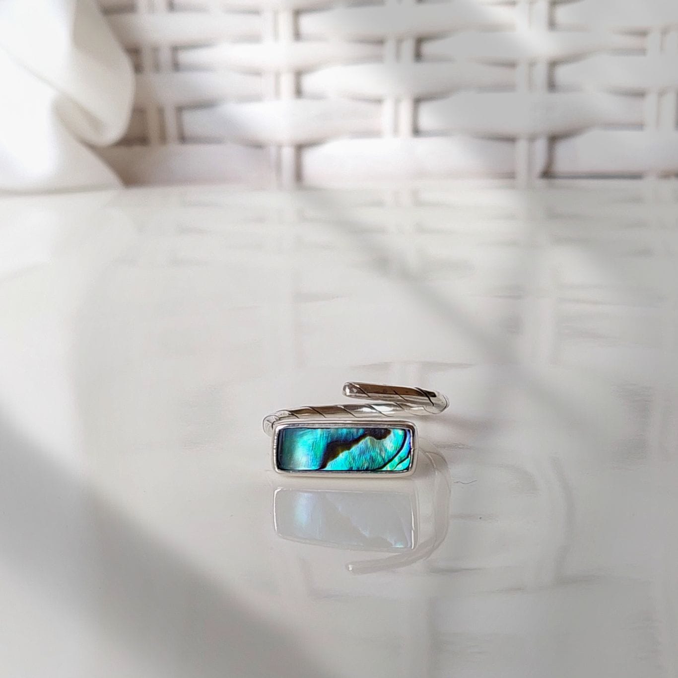 The Pāua shell used in this Ring is 100% natural and non-repeating. No two shells share the same color patterns or light reflections, making every Pāua shell Ring truly one of a kind.