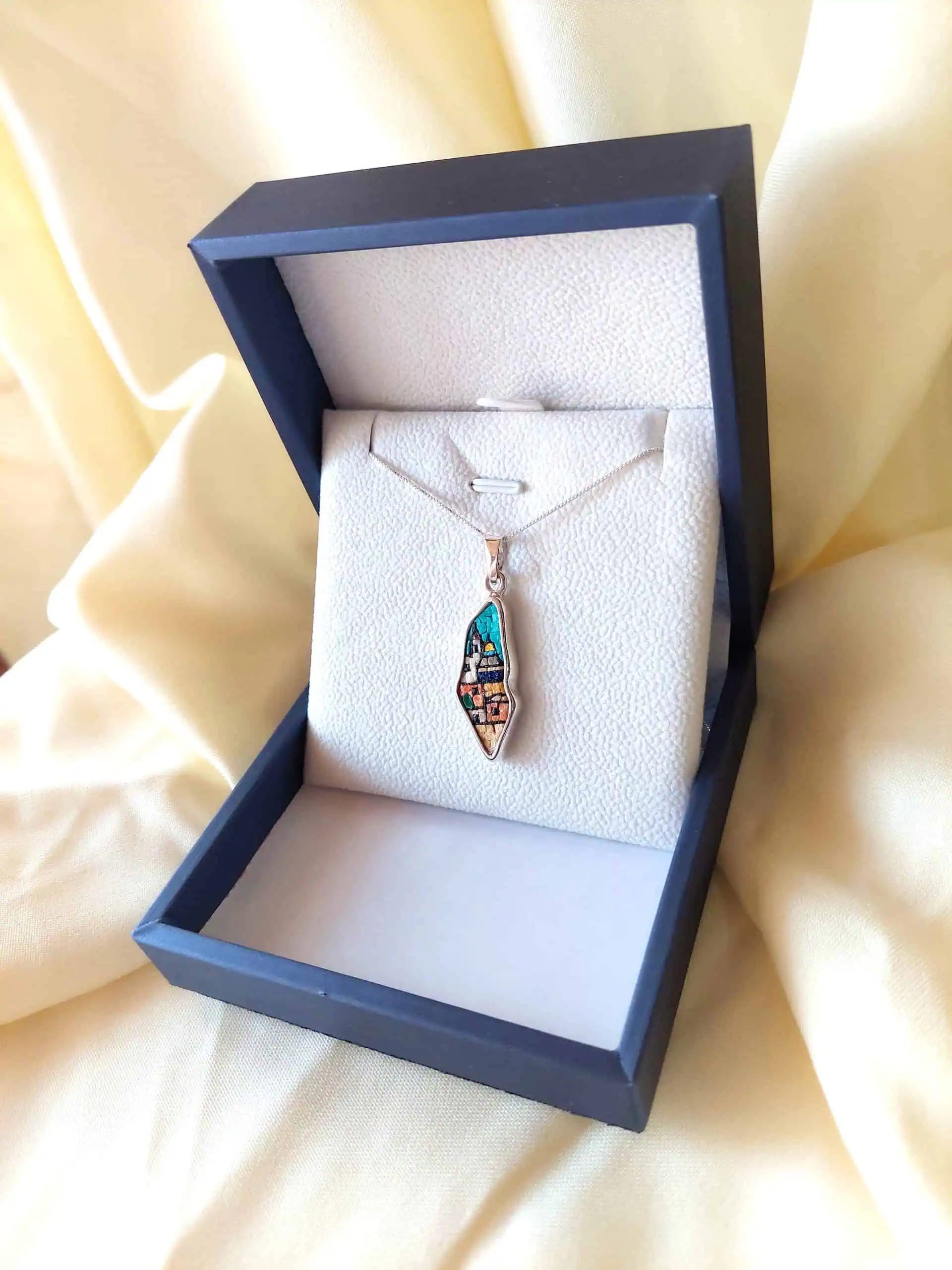 Wear a symbol of heritage and faith with the Map of Palestine Micro Mosaic Jerusalem Necklace. Crafted with 925 sterling silver, natural Jerusalem stone, and turquoise, this handmade piece represents the timeless beauty of Palestine and Jerusalem’s iconic landmarks.