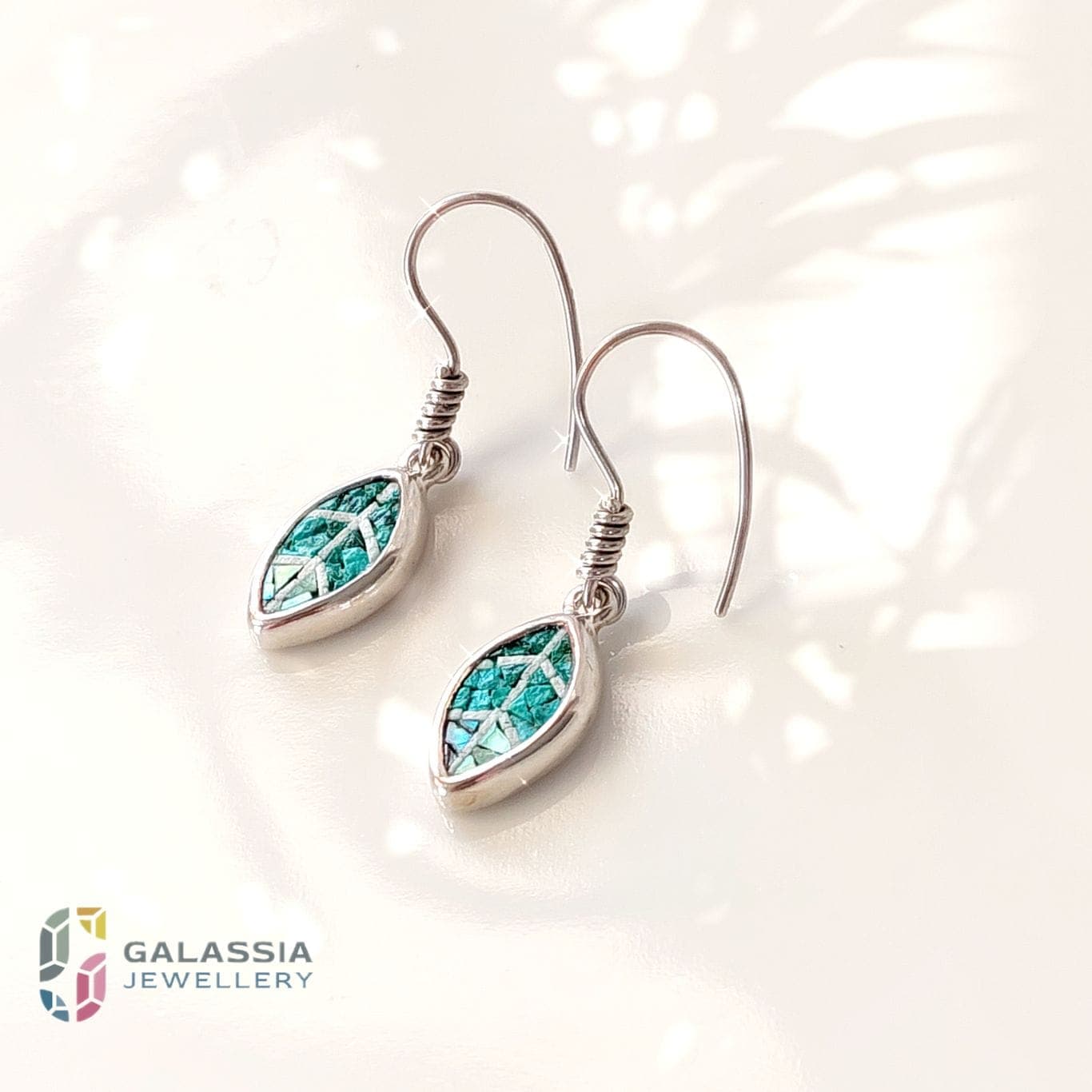 Olive leaf Earrings , a stunning 925 sterling silver micro-mosaic Earrings designed to symbolize the peace, and deep roots inspired by the old olive trees in Palestine. Handcrafted with precision, this unique piece features a delicate olive leaf design with intricate micro mosaic details, making it a must-have for jewelry lovers.
