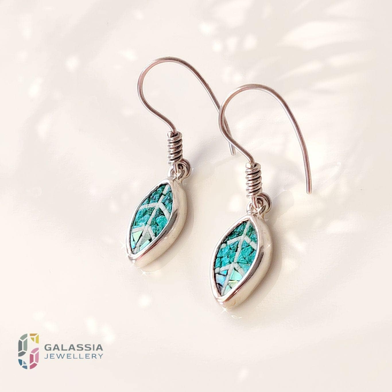 Our Sterling Silver Olive Leaf Micro Mosaic Earrings, a handcrafted masterpiece inspired by nature symbolizes peace and strength. Made from 925 sterling silver with malachite stone and seashell. Each piece is meticulously handcrafted, ensuring a piece of unique and meaningful jewelry.