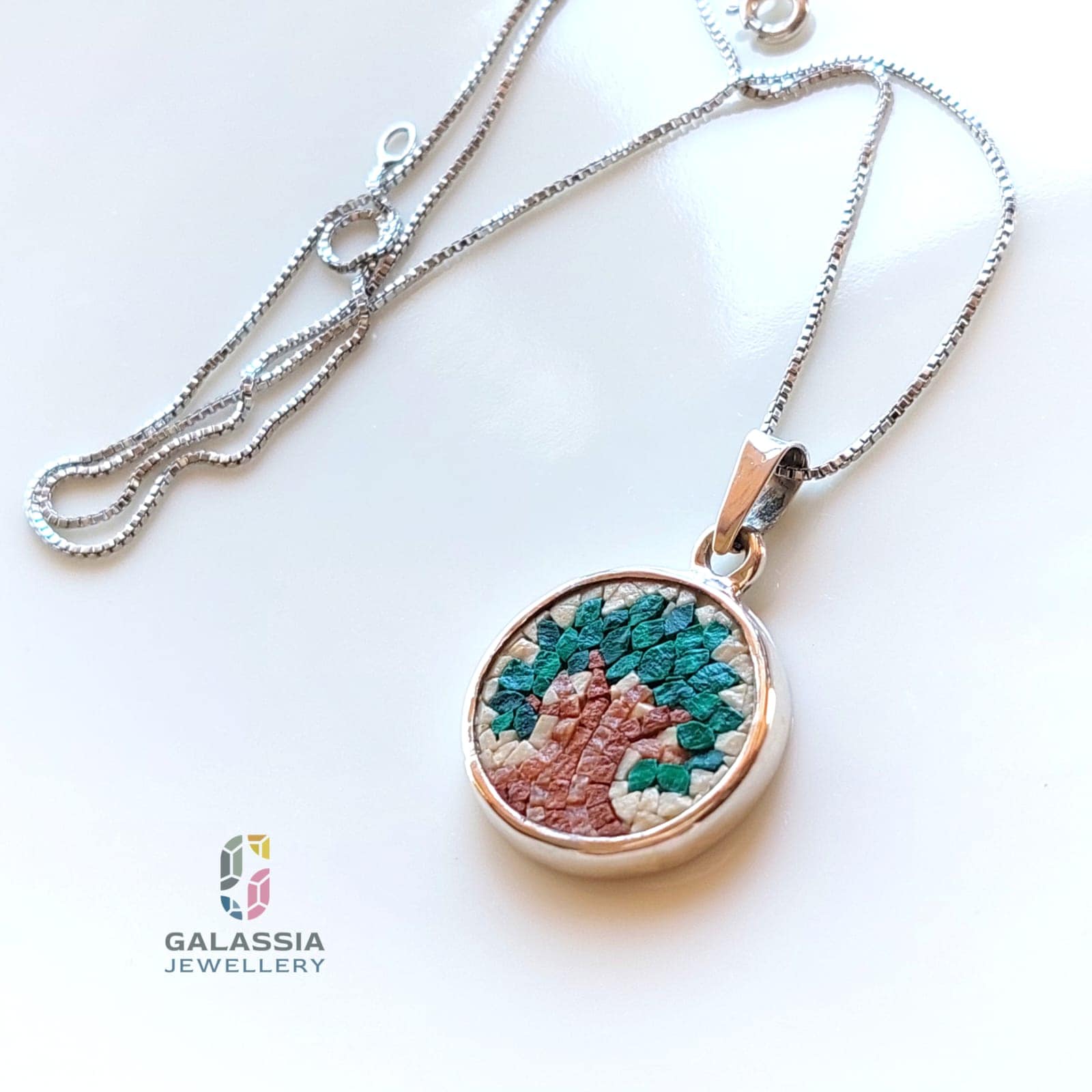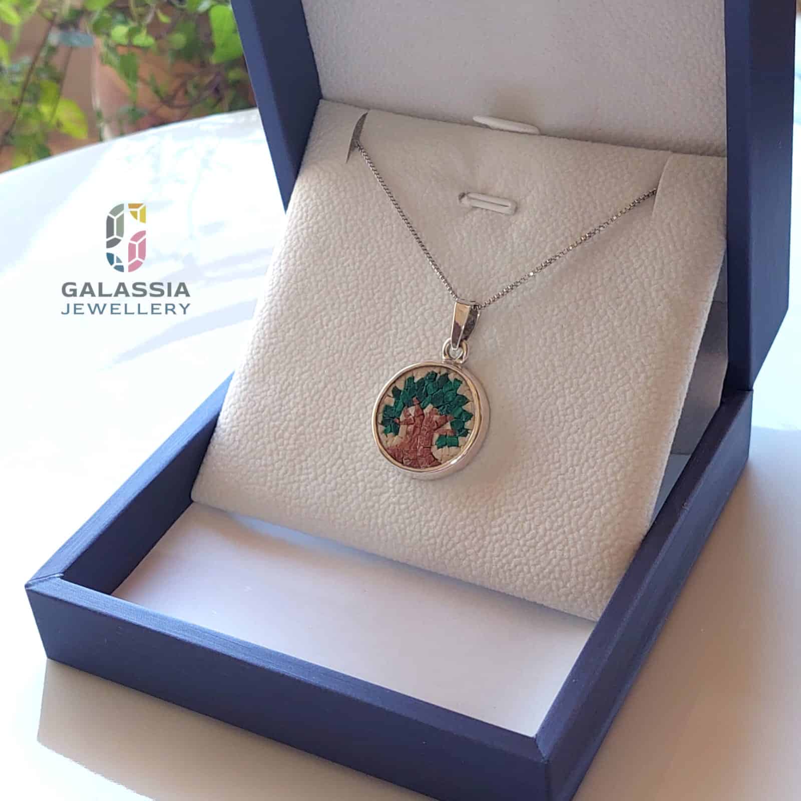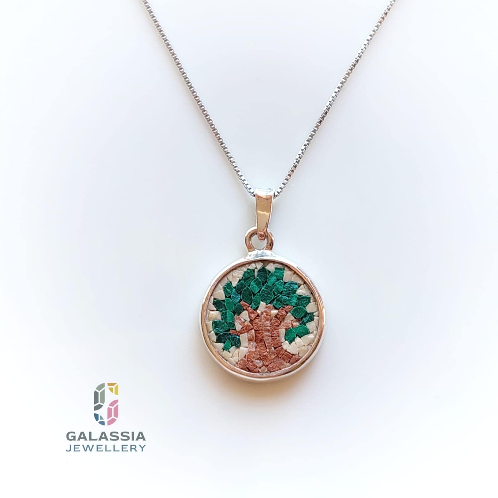 Olive Tree Micro Mosaic Necklace in Green Handmade Sterling Silver