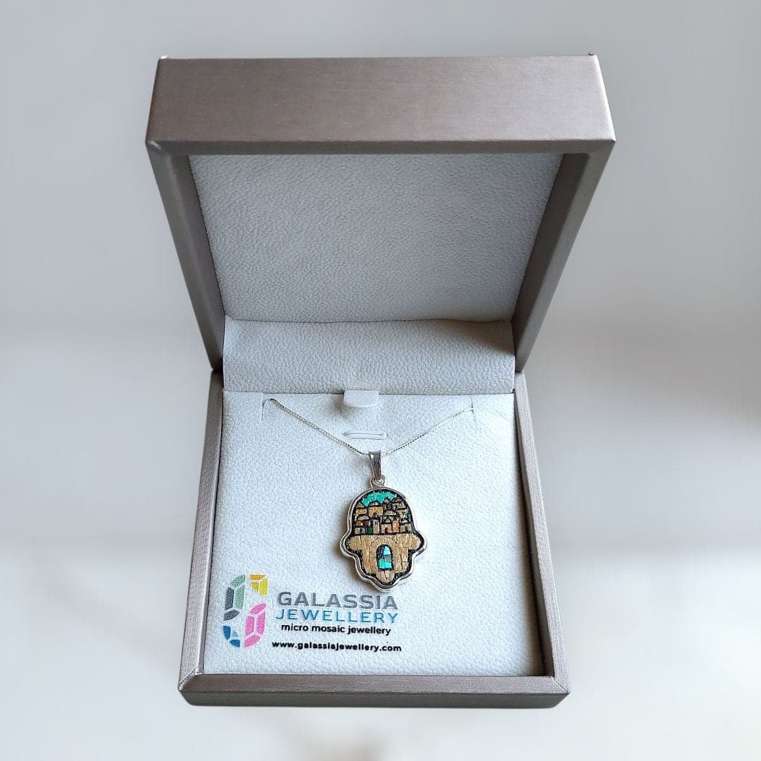 Featuring the Palestinian history and culture with this exquisite Open Hand Pendant . Each piece is meticulously handcrafted using the micro mosaic technique, featuring natural stones from Palestine, including Jerusalem stone and turquoise.