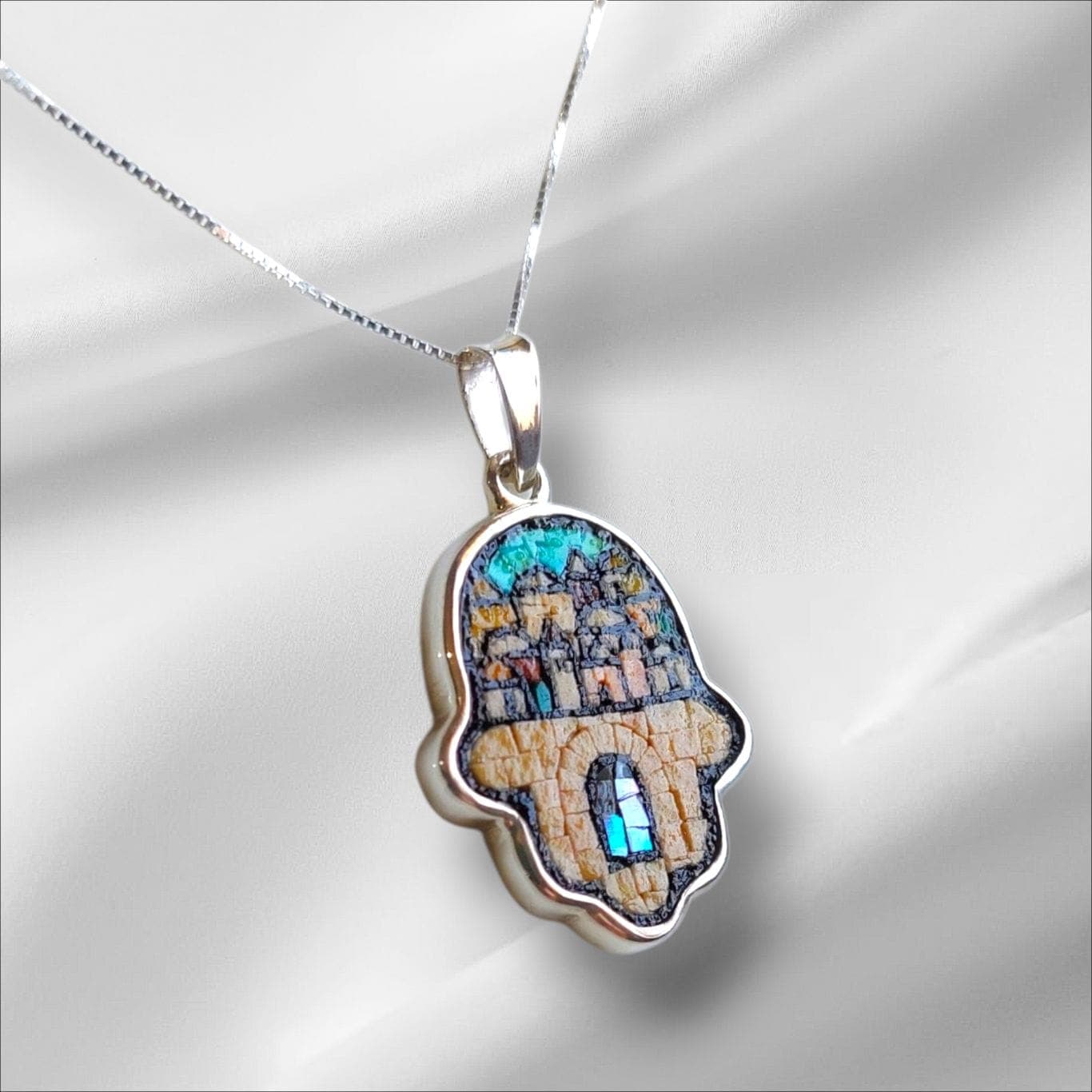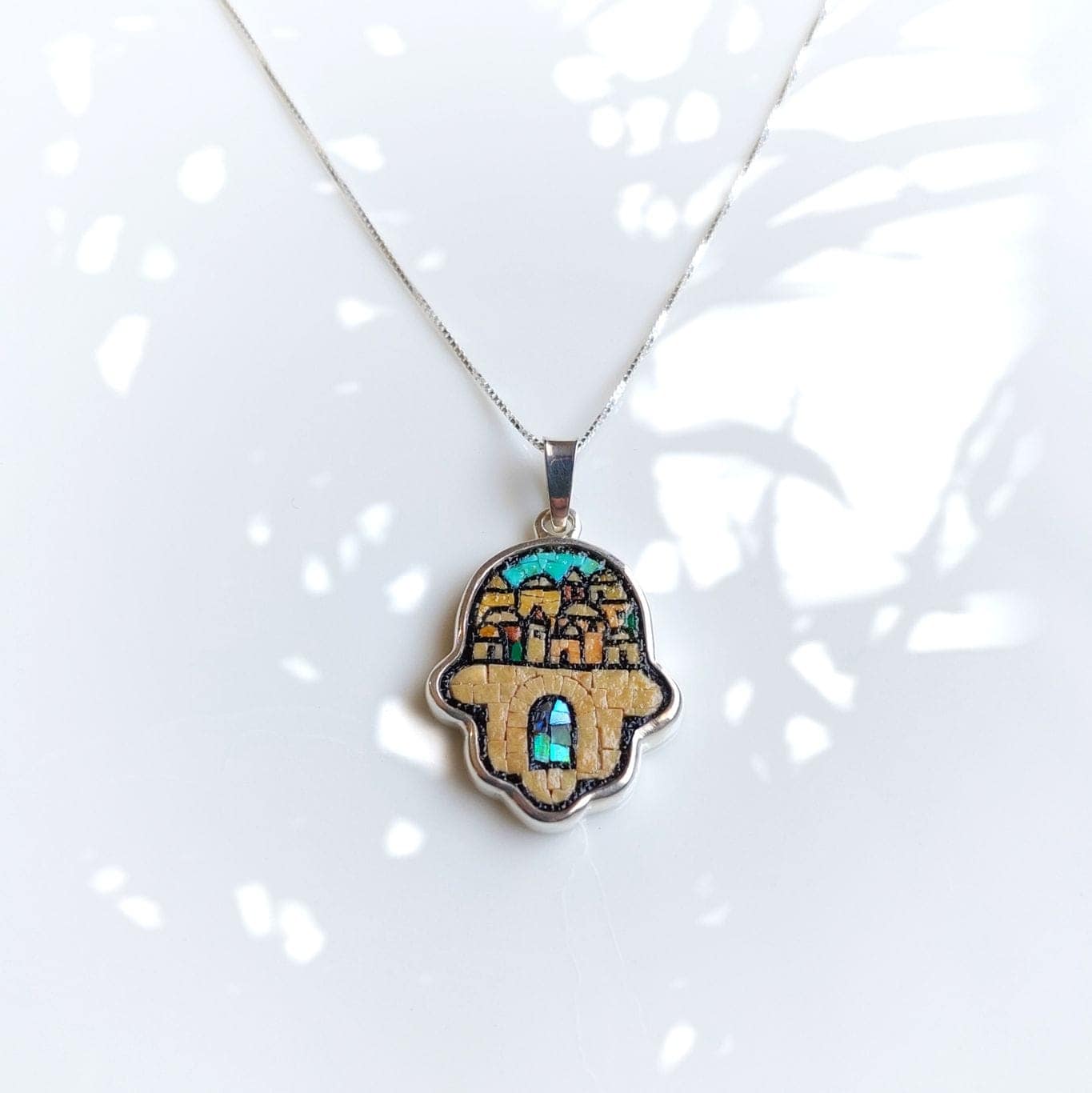 Wear a symbol of protection and connection . the Open Hand Pendant . Crafted with 925 sterling silver, natural Jerusalem stone, and turquoise, this handmade piece represents the timeless beauty of Palestinian old city landscape .