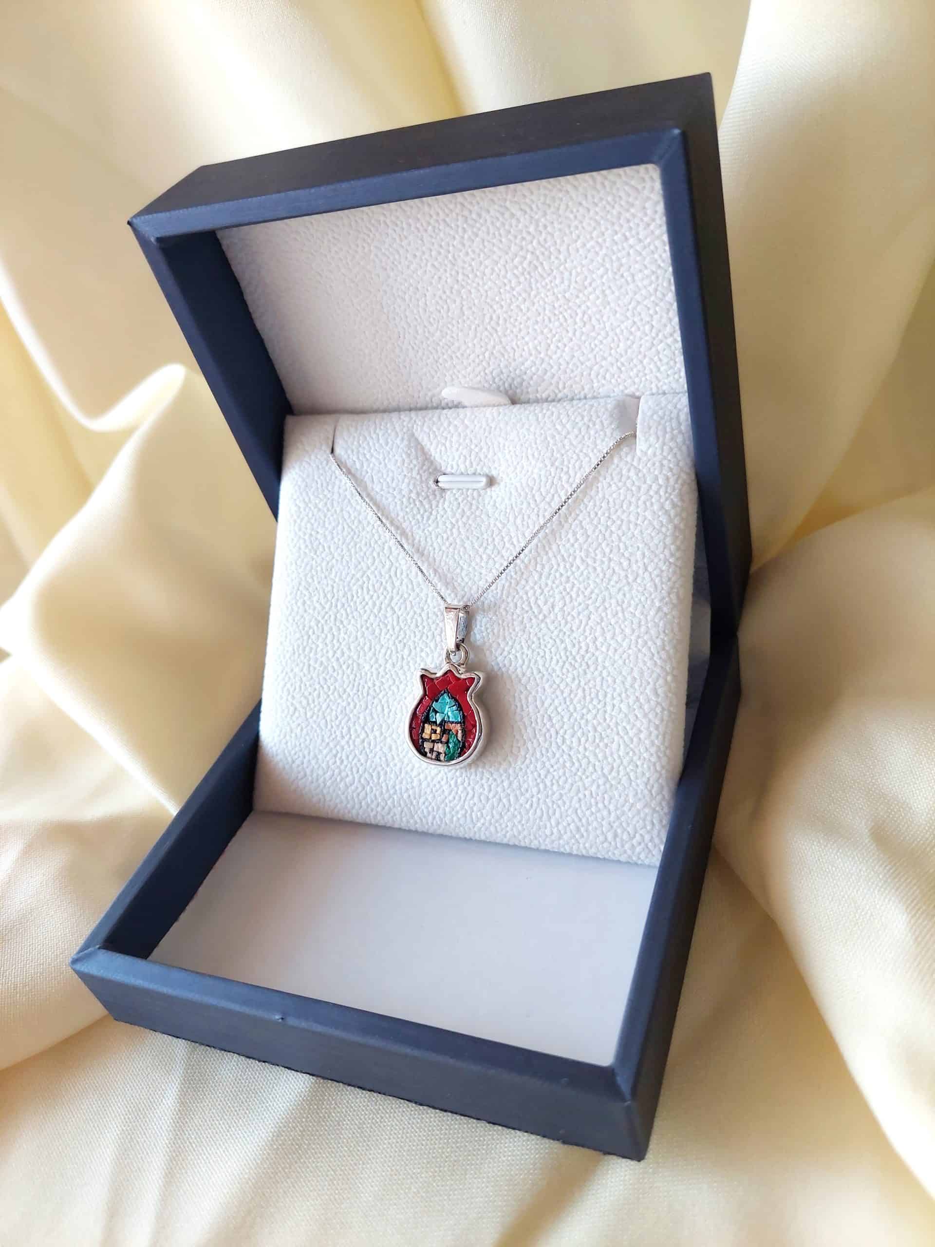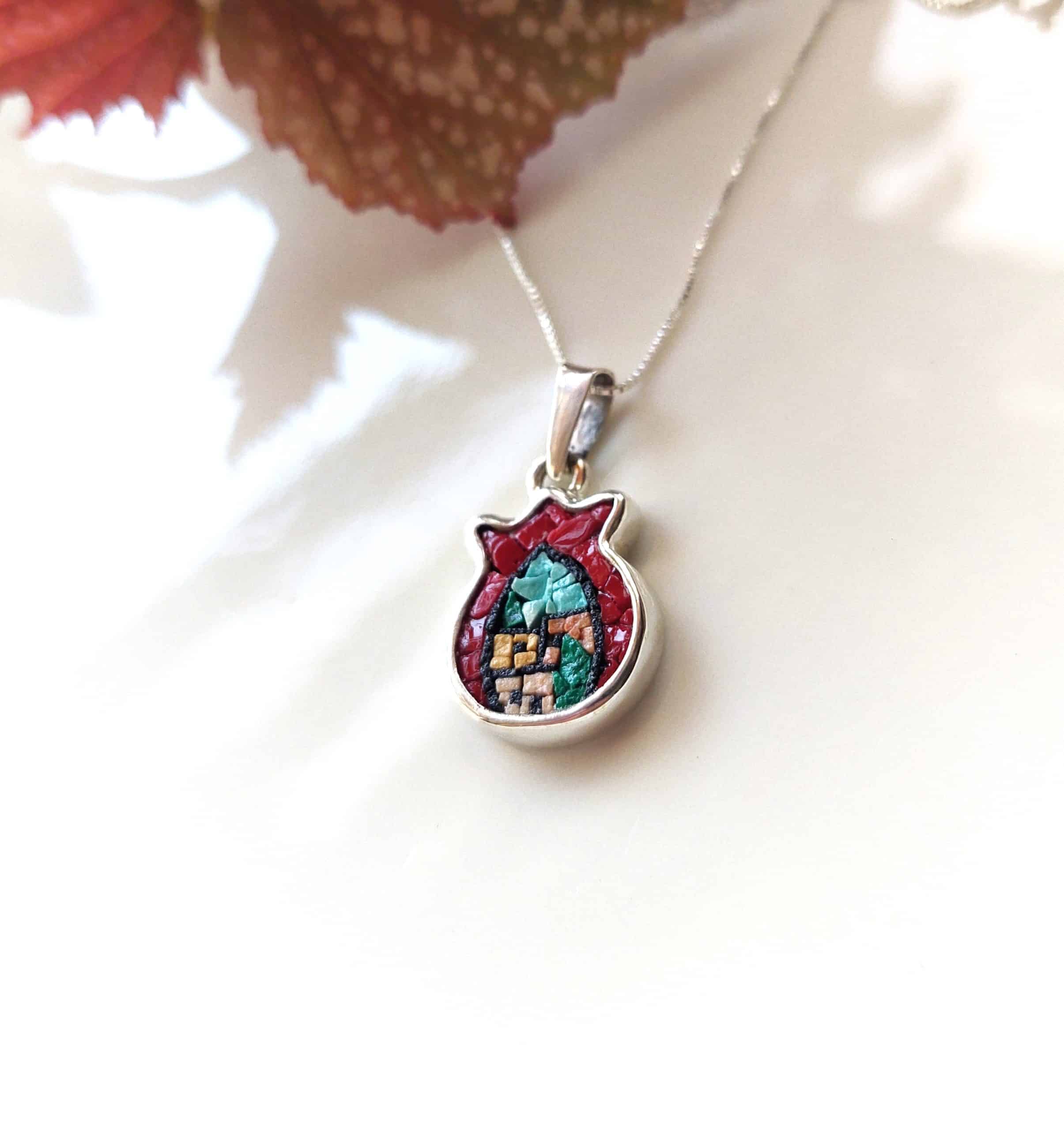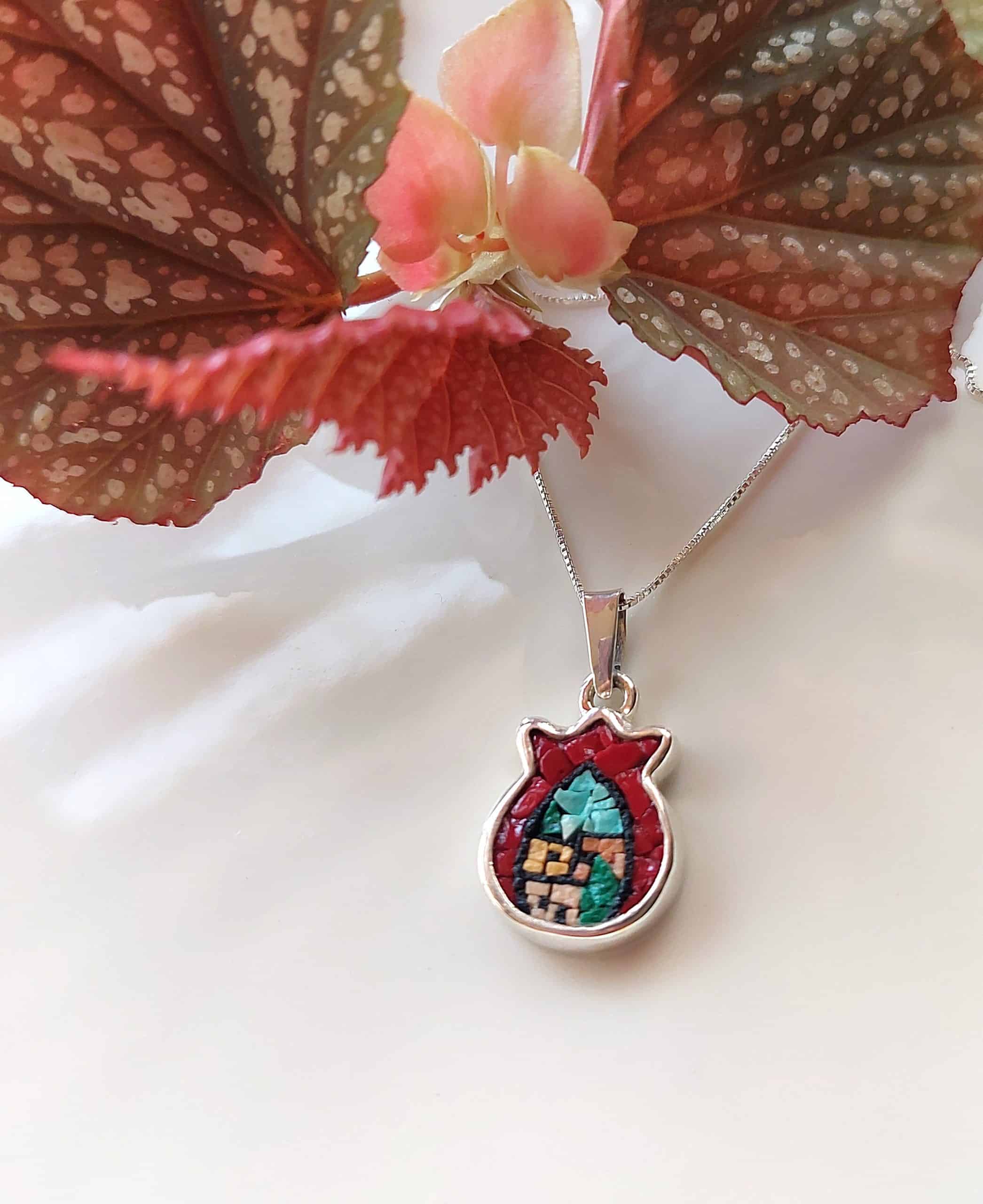 Elegant Red Pomegranate Micro-Mosaic Necklace, featuring intricate red mosaic detailing and a charming old village design. A timeless piece of art and craftsmanship, perfect for adding a unique touch to your jewelry collection.