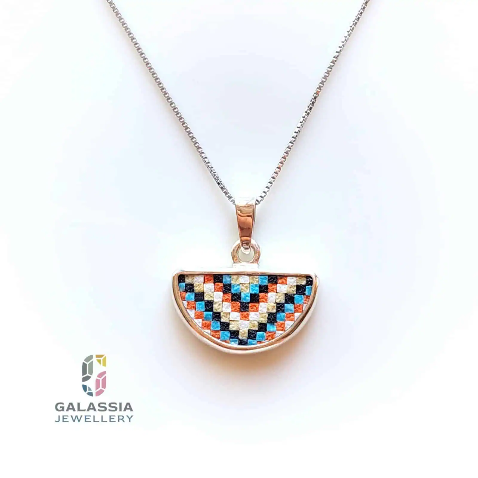 Our micro-mosaic pieces are crafted by stacking stones tightly without gaps, using a specialized adhesive, and securing them in a silver frame for extra durability.