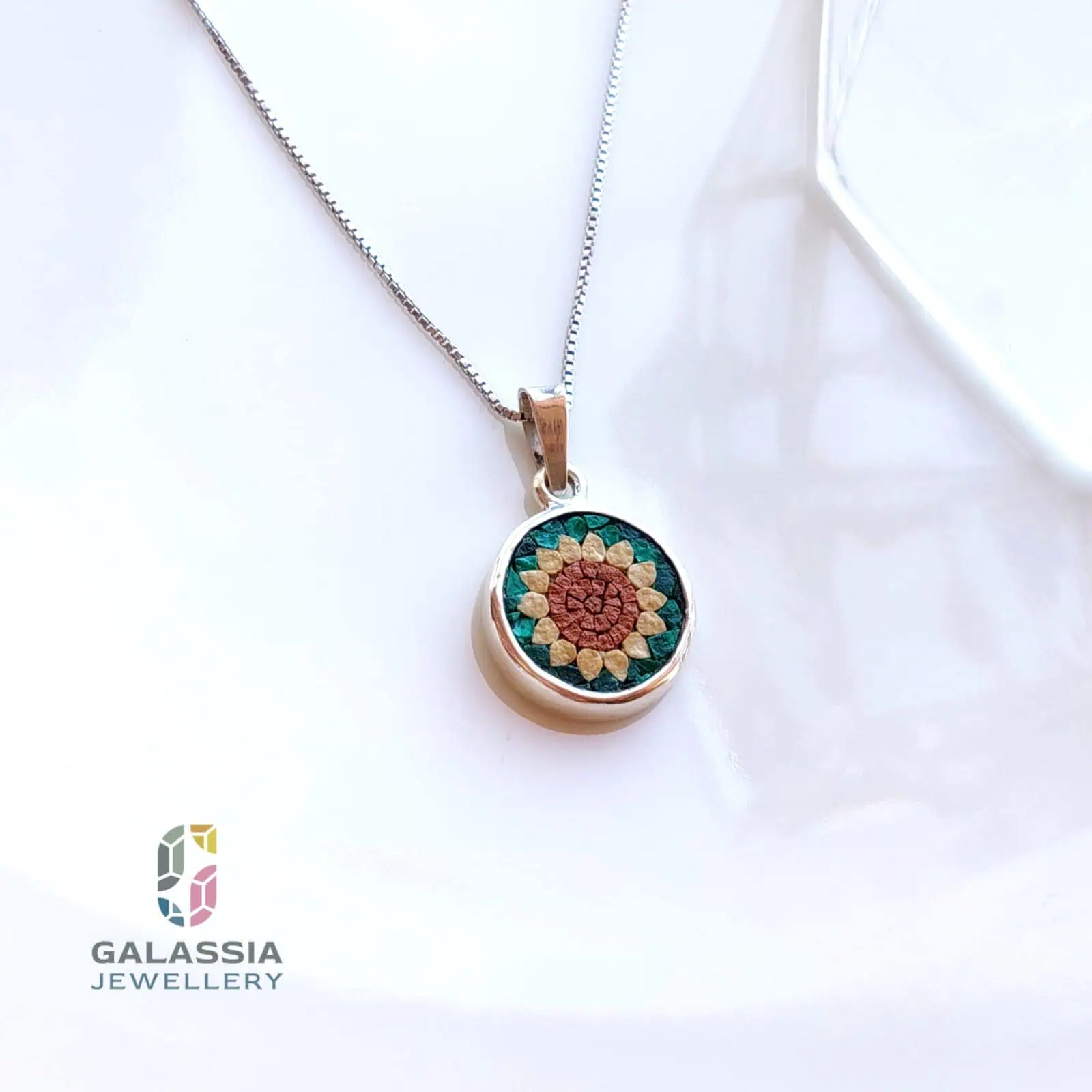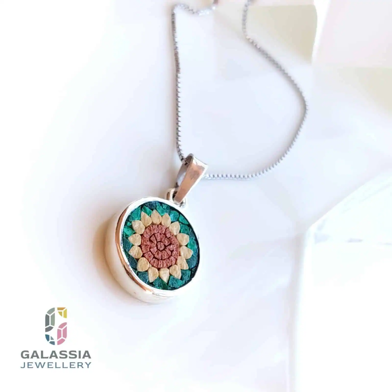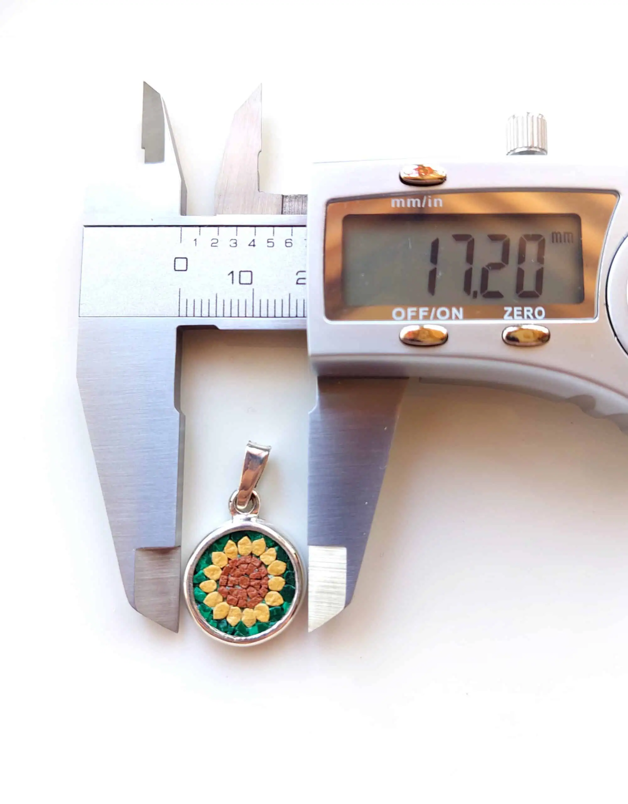 Our micro-mosaic pieces are crafted by stacking stones tightly without gaps, using a specialized adhesive, and securing them in a silver frame for extra durability.