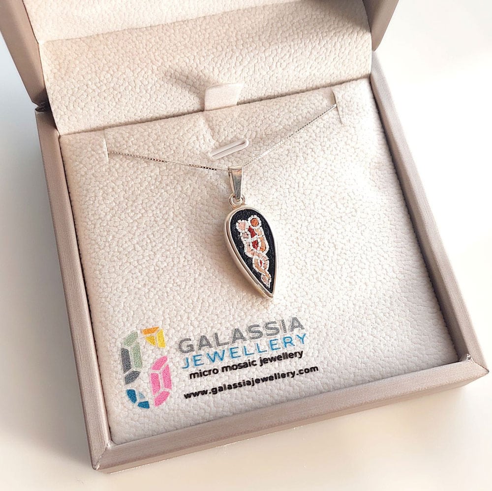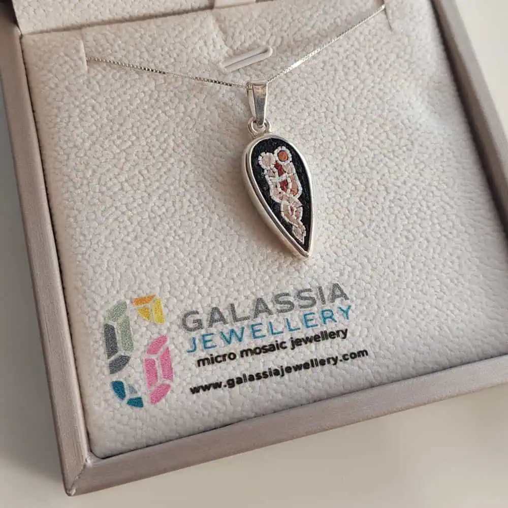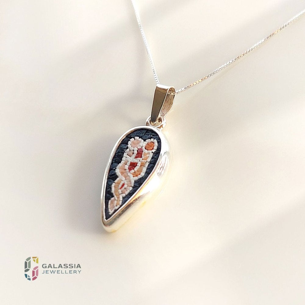 Experience the beauty of love with this Handmade Micro Mosaic Lovers pendant , crafted using natural stones. Framed in 925 sterling silver, this love pendant symbolizes love strength and historical significance. Each piece is meticulously handcrafted, insuring a unique and meaningful jewelry that blends artistic craftsmanship with deep meaning.