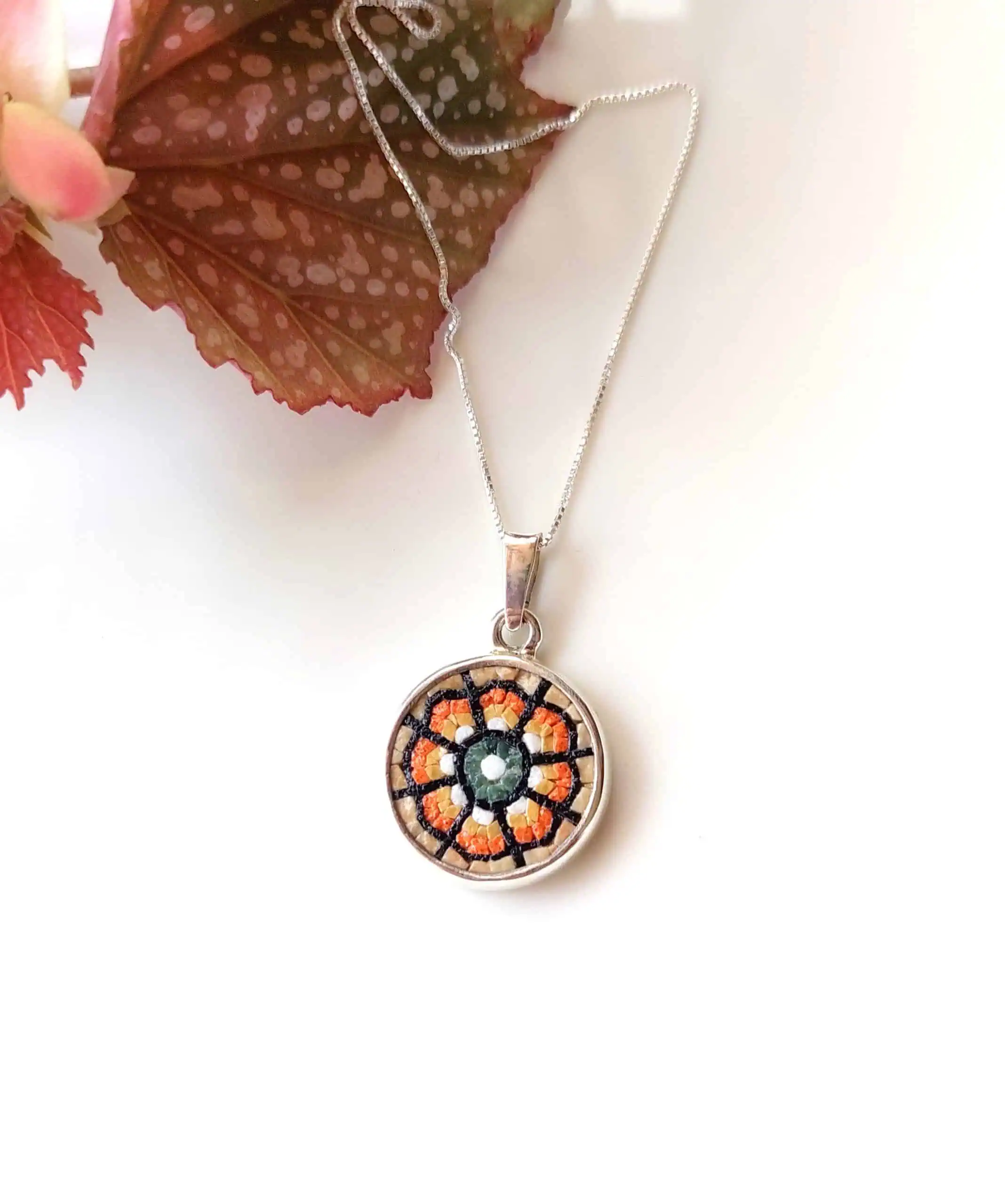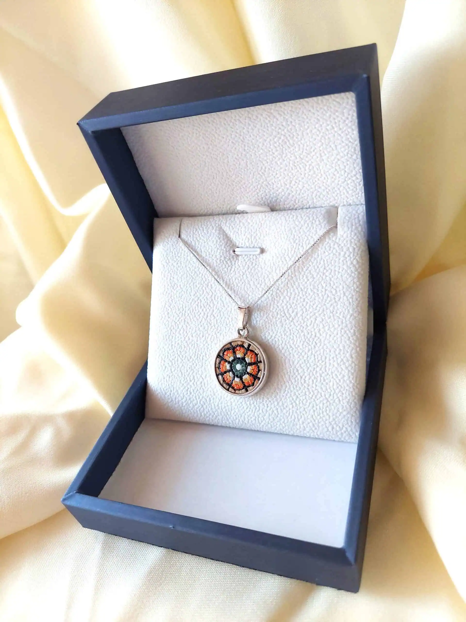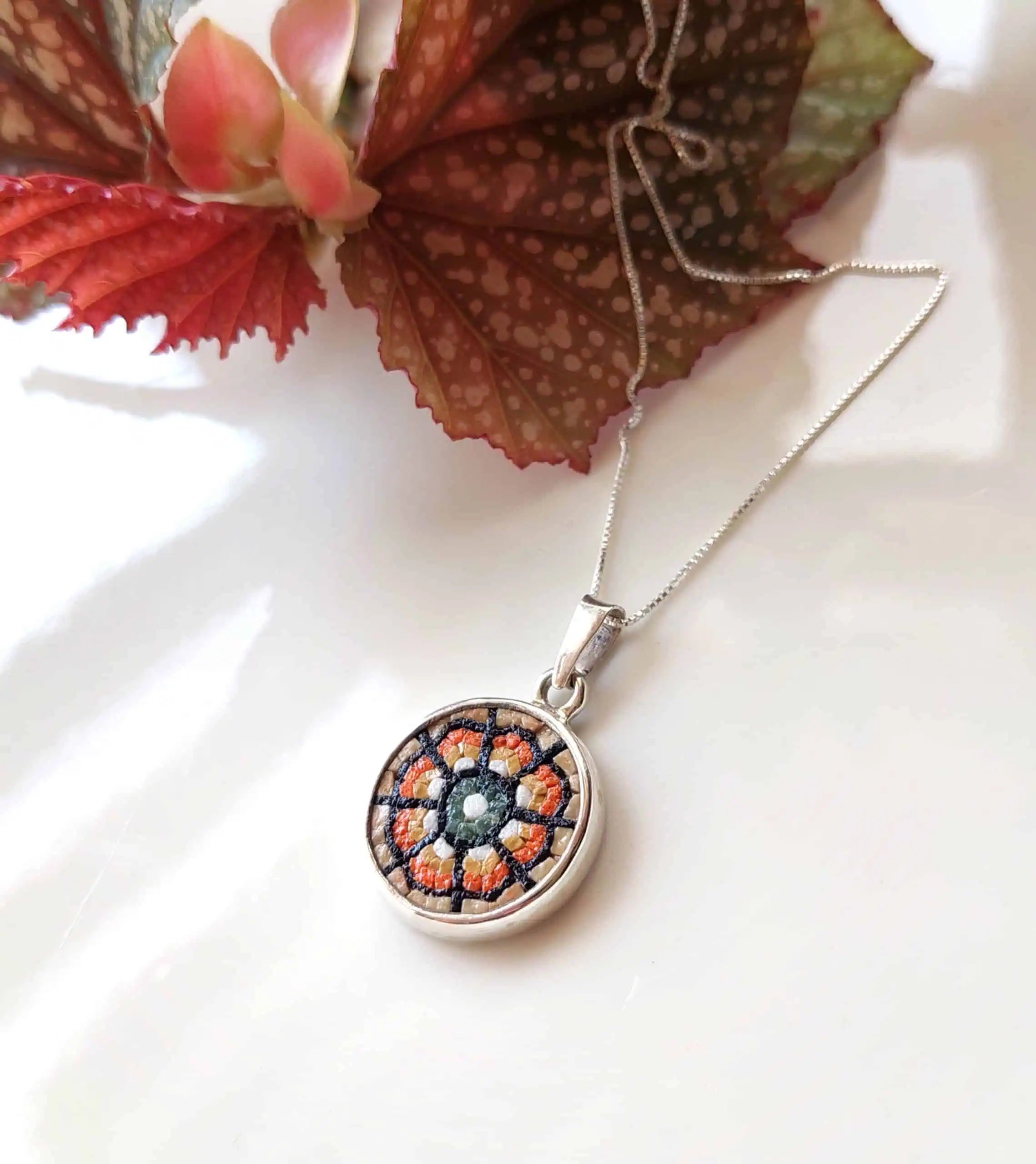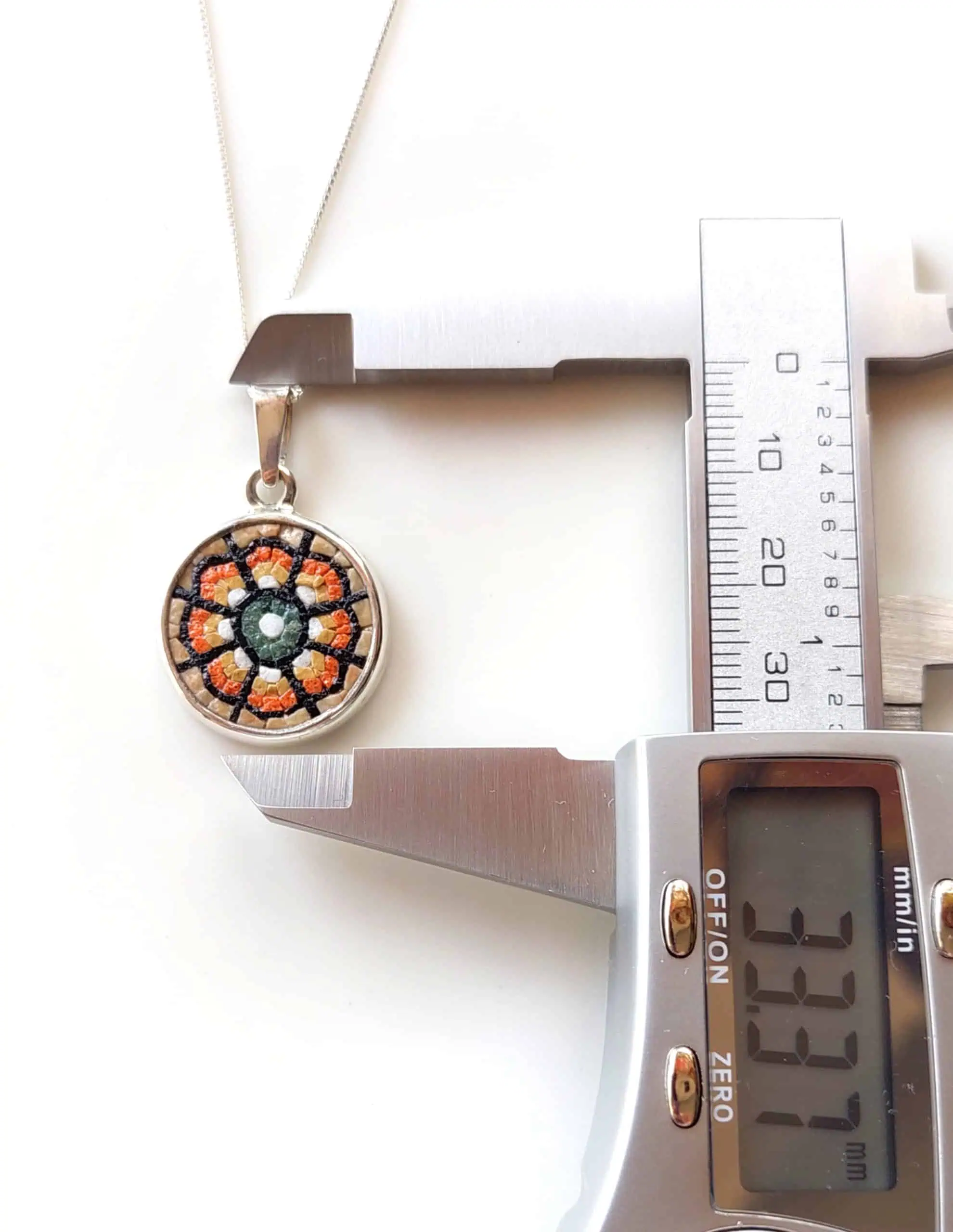 Our micro-mosaic pieces are crafted by stacking stones tightly without gaps, using a specialized adhesive, and securing them in a silver frame for extra durability.