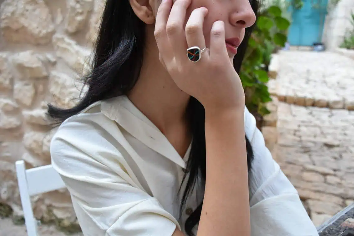 The jewelry is completely handmade starting with the process of designing and drawing, then cutting up the stones and shaping them, and finally silversmithing.
